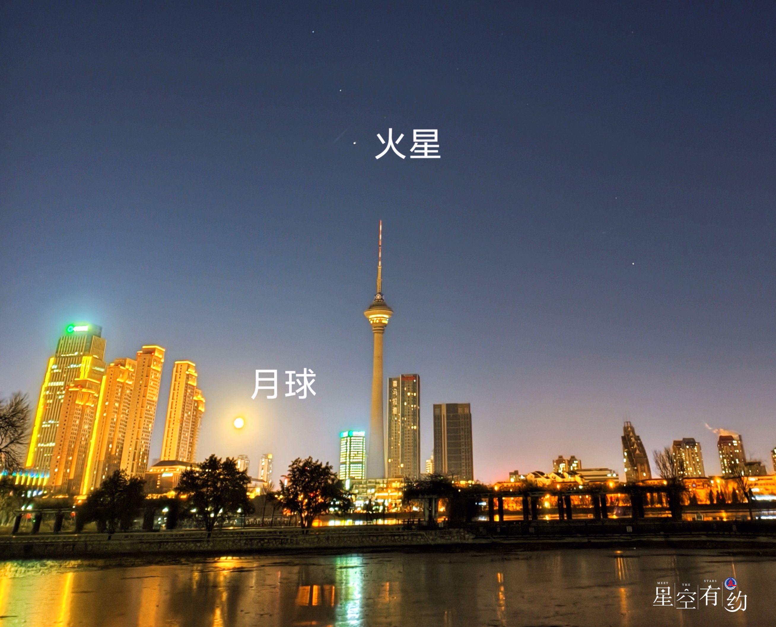 “在欣赏过明亮的金星后,当晚,一场非常值得一看的火星伴月将现身夜空。火星位于月亮下方,二者之间的角距离很近,不到1度,近乎两个满月视直径大小。如果天气晴好,感兴趣的公众可尝试用肉眼观测。”中国天文学会会员、天津科技馆天文科普专家宋媛媛说。