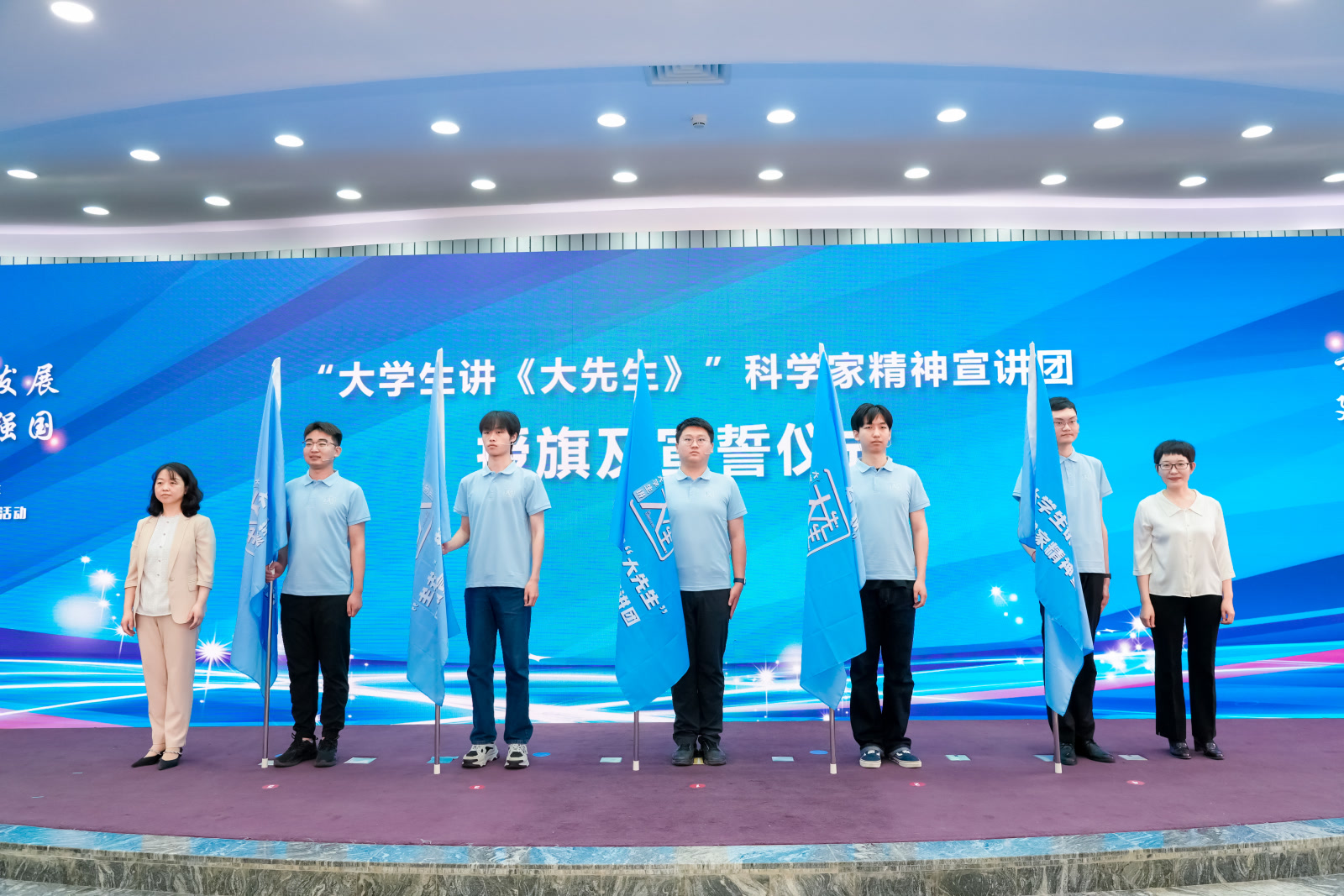 现场,市科协将“大学生讲《大先生》科学家精神宣讲团”的旗帜交到北方工业大学、清华大学、北京石油大学、北京中医药大学和北京科技大学的高校学子手中。五支高校青年志愿队握拳宣誓:“以赤子之心传承科学家精神,以青春之声讲述科学故事……让大先生精神在新时代薪火相传!”