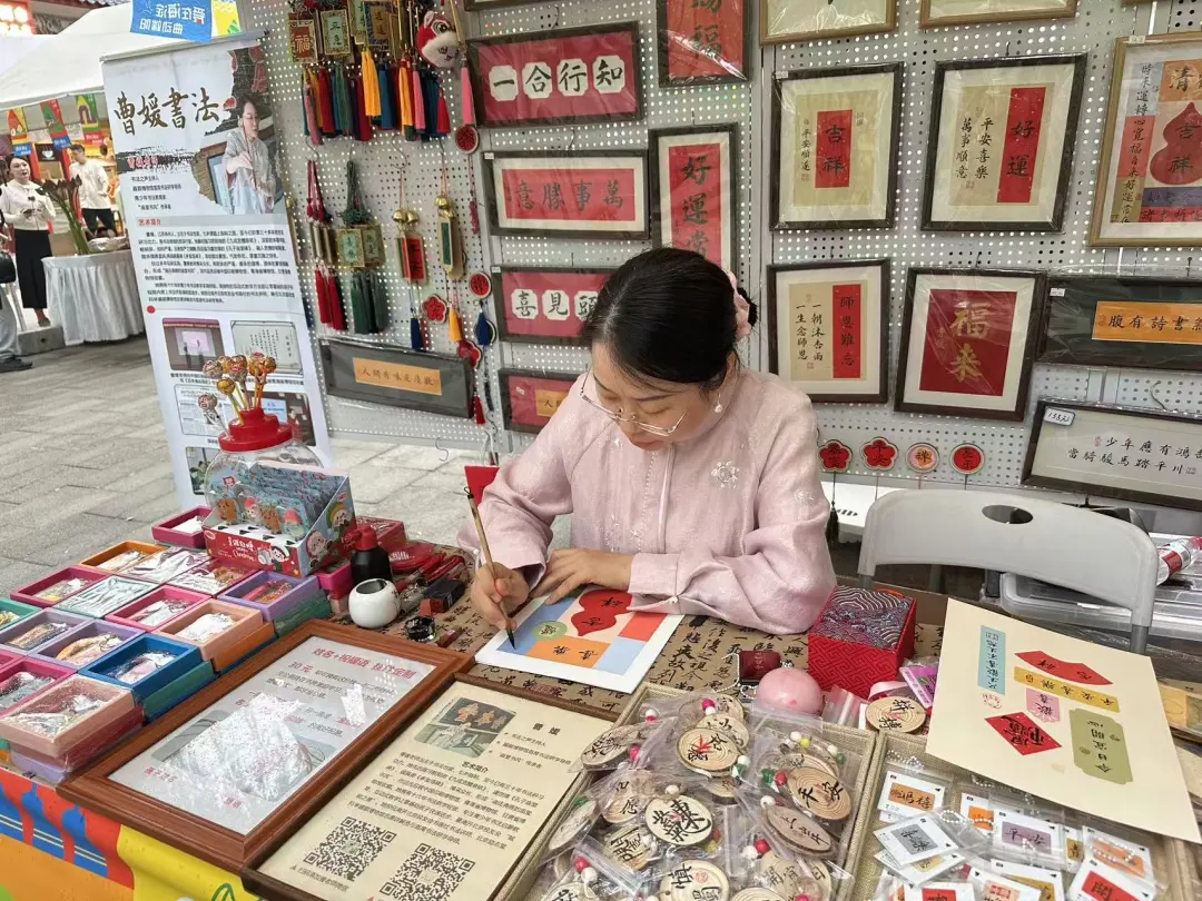 旁边的见字如面书法摊位上,摊主曹媛身着传统旗袍,悉心地为市民书写着祝福语,她告诉记者:“书法是中华文化的瑰宝,也是传递情感与意境的独特方式,希望可以让更多的人领略到书法的魅力。”