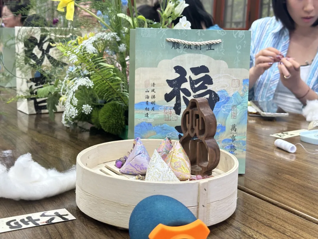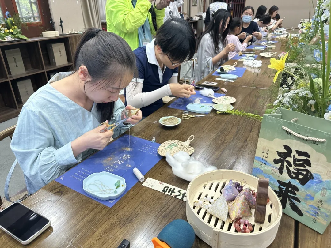 旁边的赵阿姨则已初具成果,她将填满棉花和中药香粉的锦囊托在掌心,满意地嗅了嗅:“这香气提神醒脑!带回去给女儿女婿,这是艾草、菖蒲、薄荷共同组合出来的香味儿,咱中国传统的宝贝!”