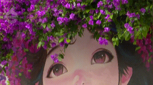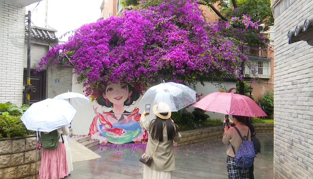 这位手捧锦鲤的少女笑靥如花、头顶是盛放的三角梅,如天然的花簪。玫紫色的花瓣飘落,不论艳阳高照还是细雨蒙蒙,你总能在这里收获一份灿烂的心情。