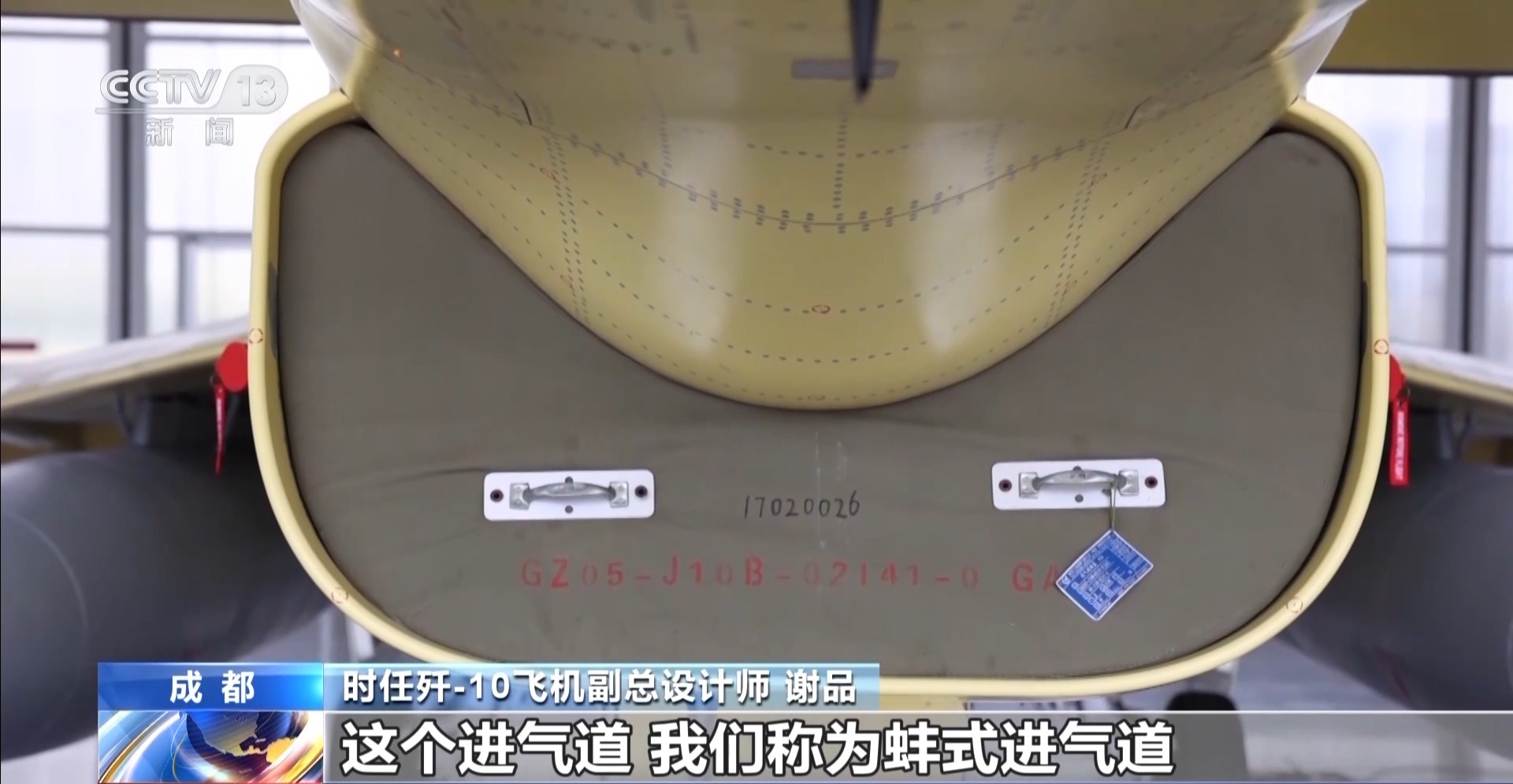 时任歼-10飞机副总设计师 谢品:这个进气道,我们称为蚌式进气道。进气道在飞机机身底下,中间有个隔缝,让飞机的低能量负面层气流能够通过缝里头排走,就减少了飞机的阻力。这种进气道的重量轻。