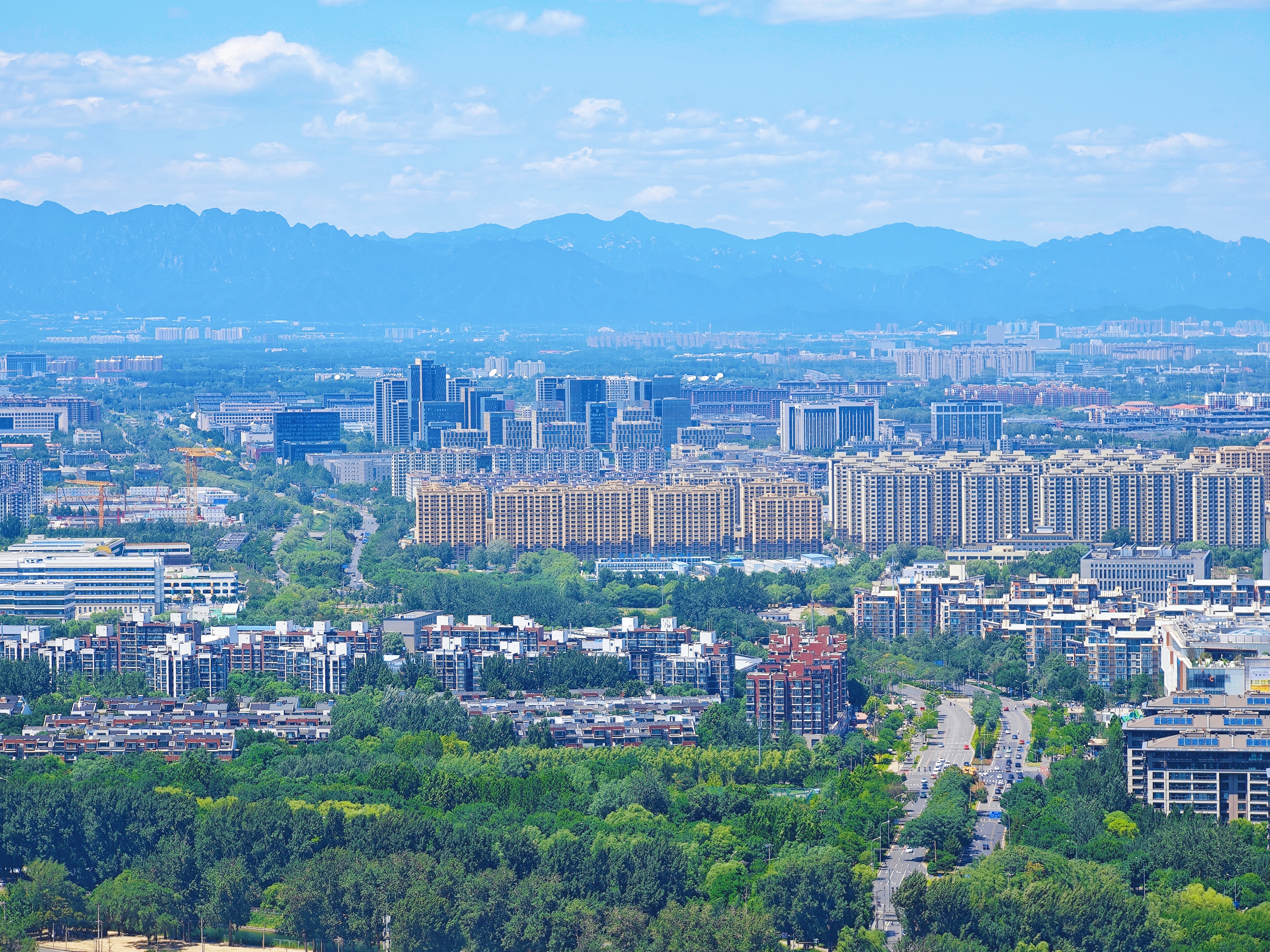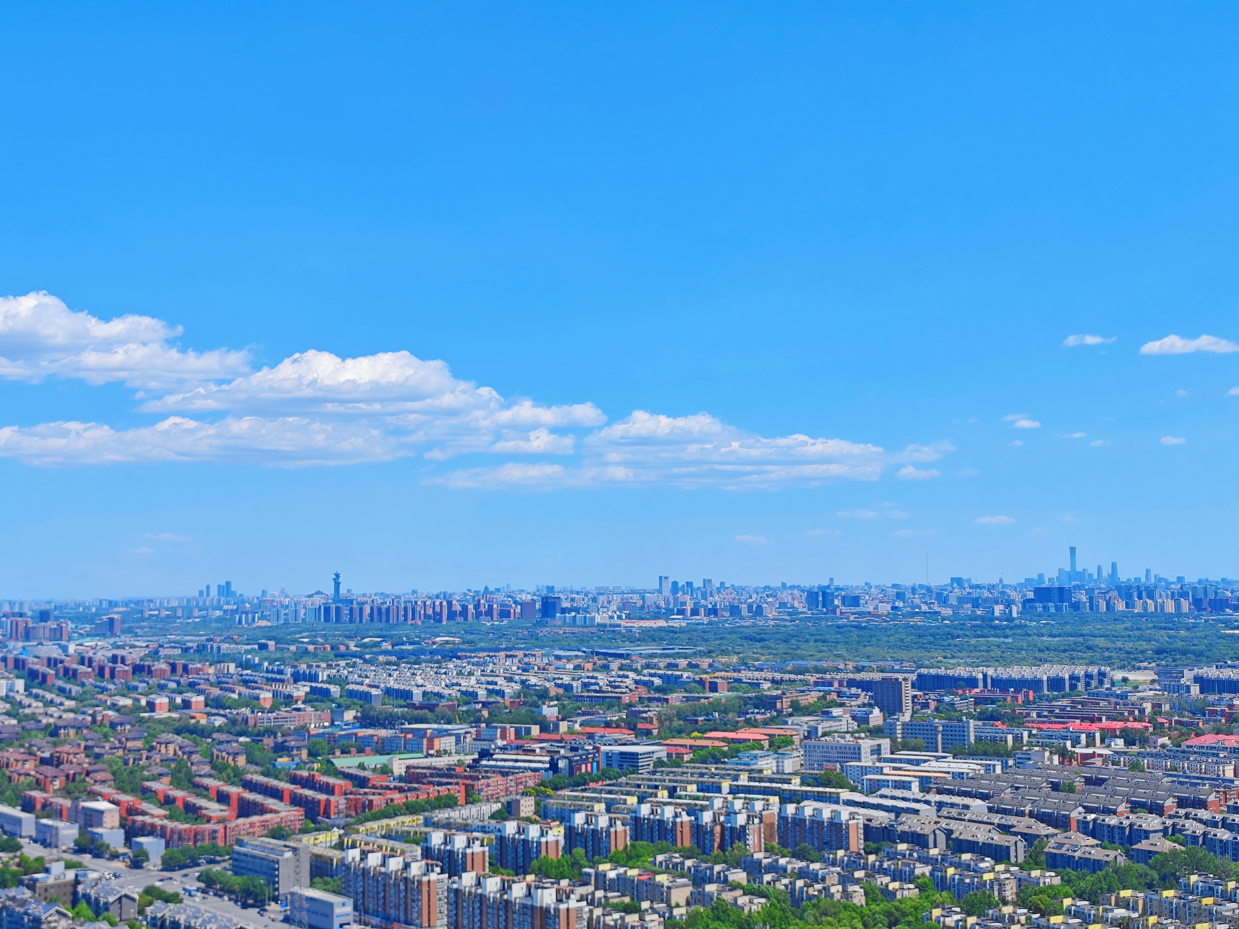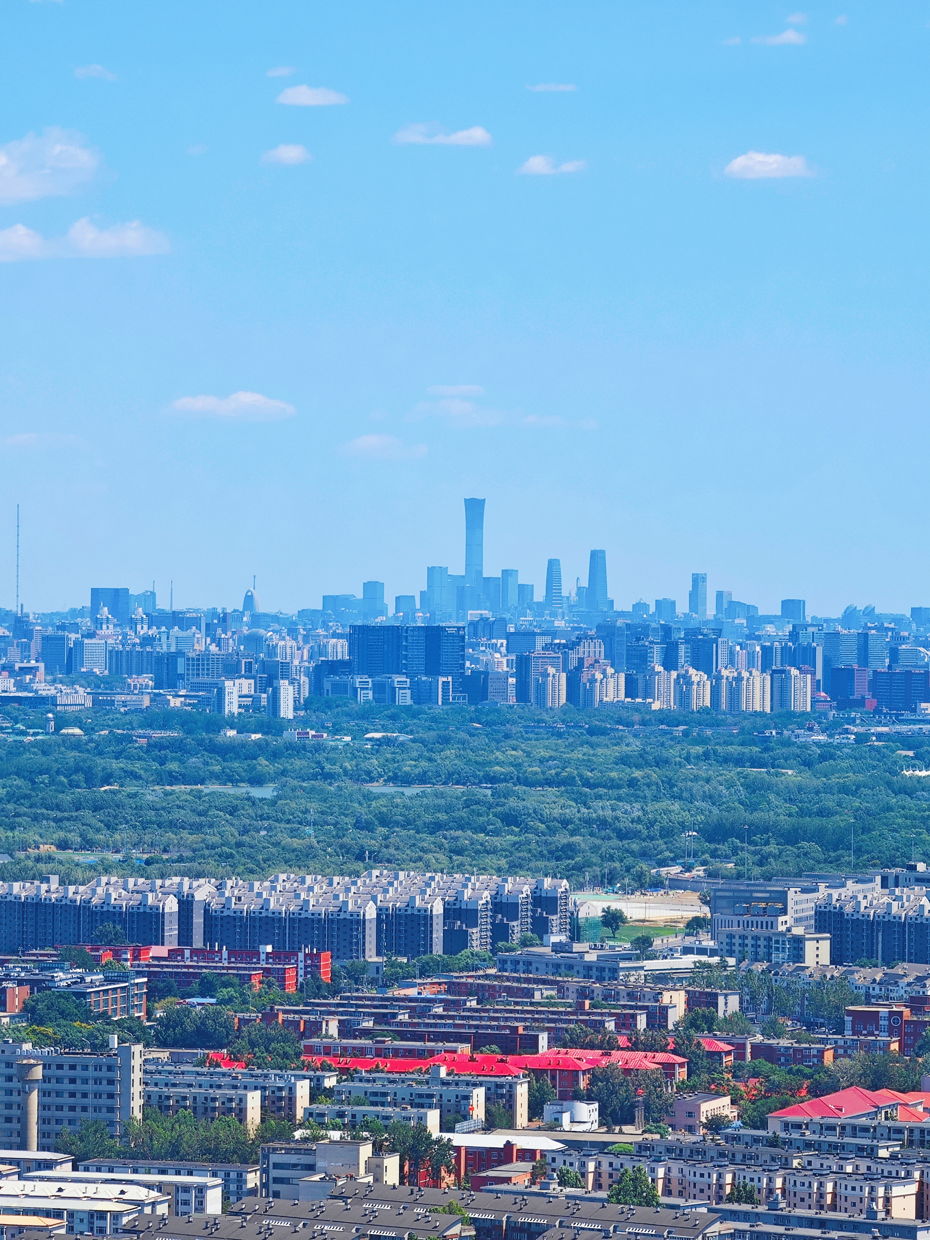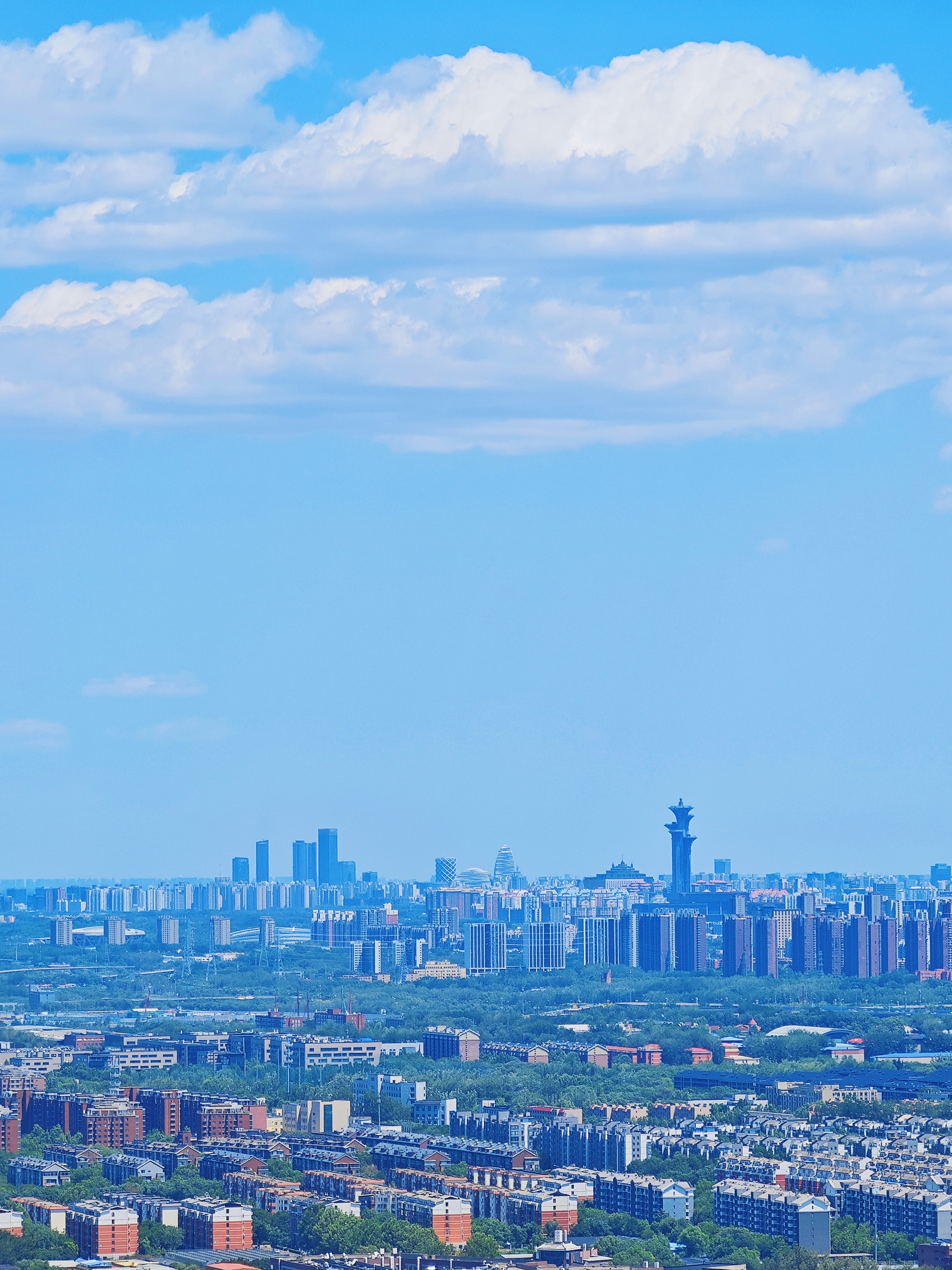 最令人惊叹的莫过于登顶望京楼时的壮阔景象。站在观景台上极目远眺,整座北京城在蓝天白云的映衬下显得格外清晰明亮。国贸CBD的玻璃幕墙反射着阳光,奥林匹克塔巍然耸立,就连远处的西山轮廓都清晰可见。微风拂过,云影在地面上缓缓流动,为城市画卷增添了几分灵动之美。不少游客纷纷举起手机,想要将这难得一见的美景永远定格。
