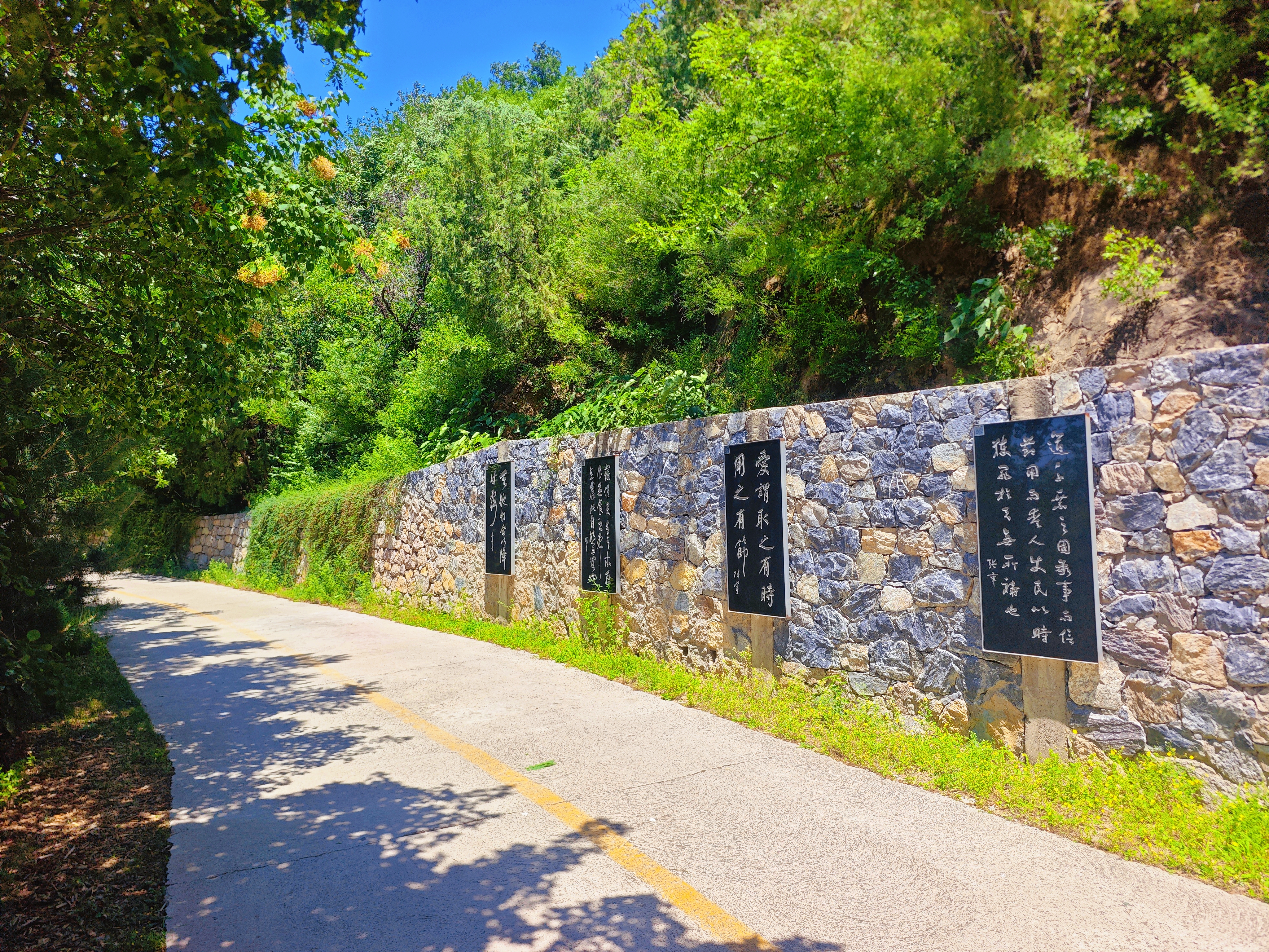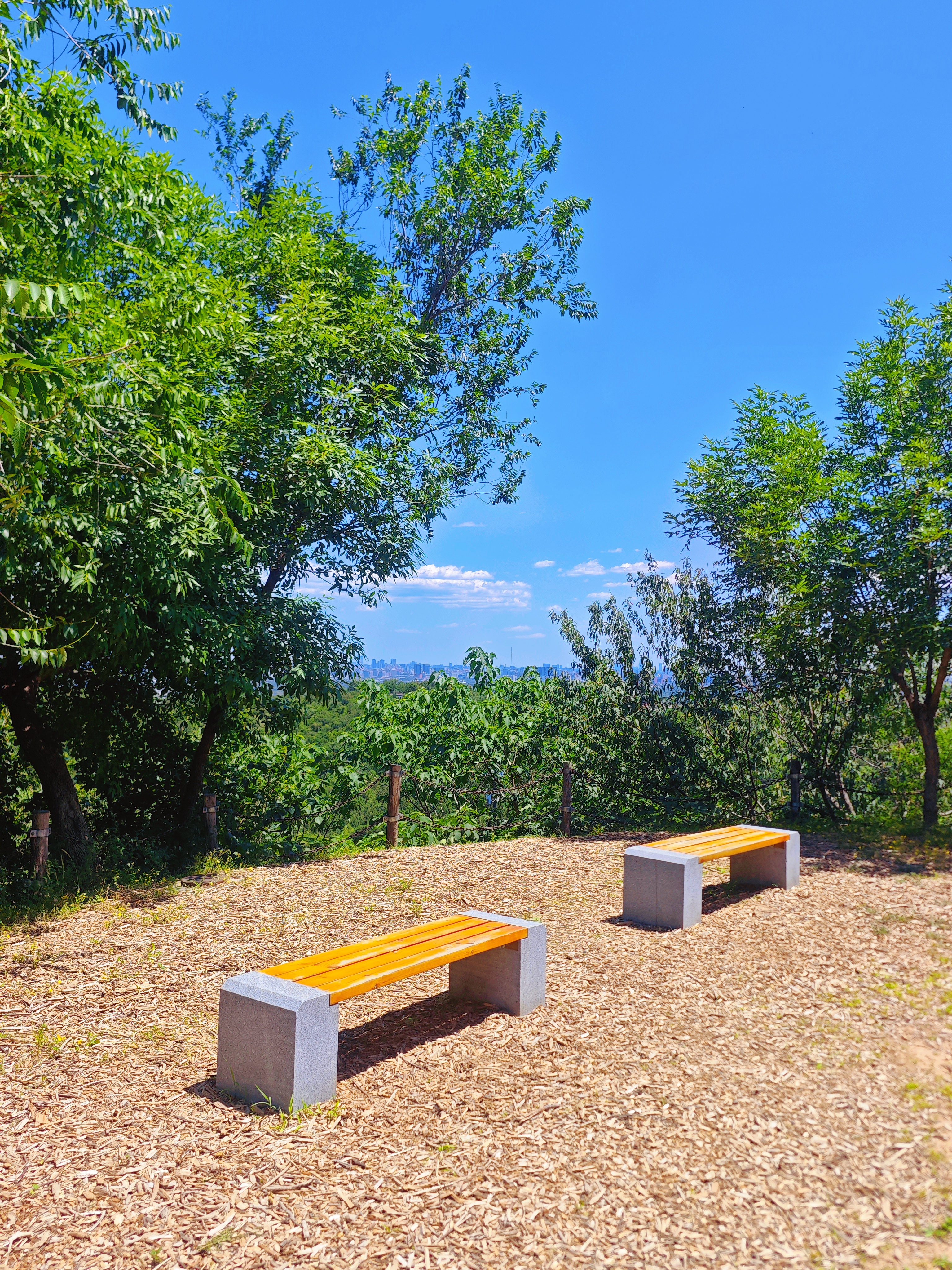 沿着蜿蜒的山间小路拾级而上,阳光透过树叶的缝隙洒下斑驳的光影,仿佛为登山者铺就了一条星光大道。道路两旁,造型古朴的木制座椅恰到好处地安置在观景最佳处,让游人得以在疲惫时小憩,同时将满目苍翠尽收眼底。
