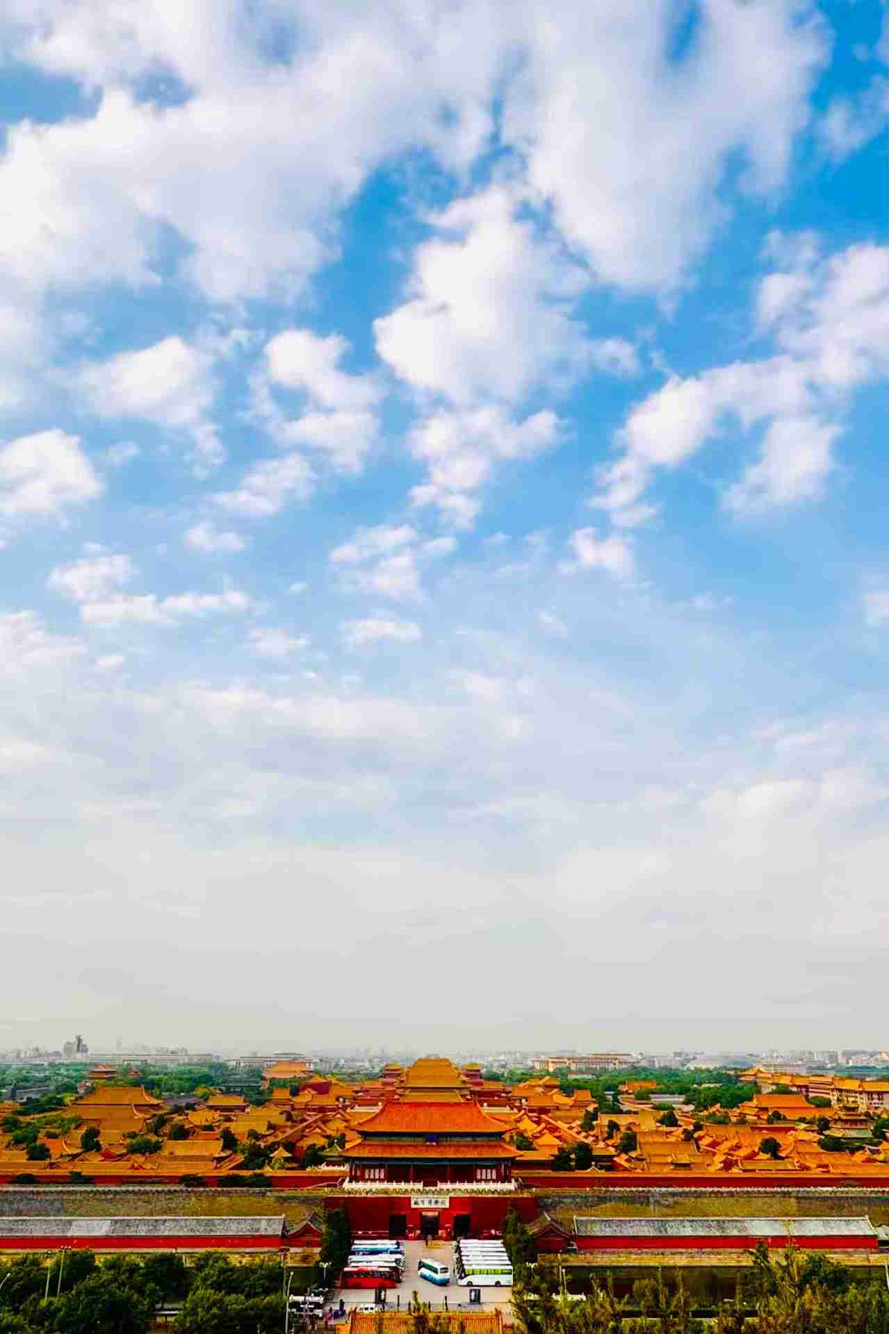 景山之巅眺望故宫,蓝天高远 ,白云朵朵,金碧辉煌的建筑群,端庄大气 ,美轮美奂!