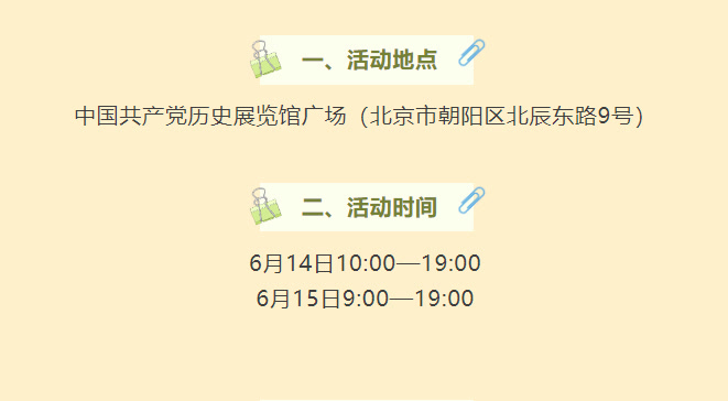 本次活动地点设在中国共产党历史展览馆广场(北京市朝阳区北辰东路9号),市集活动时间为6月14日、15日共计两天。