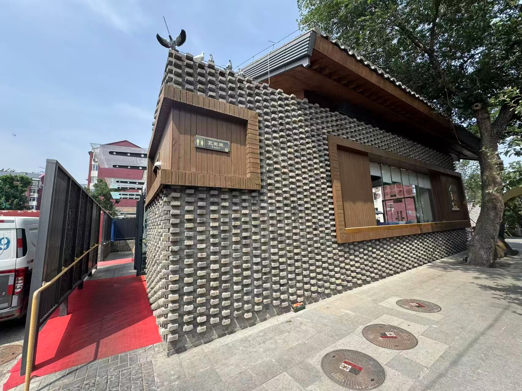 石景山区模式口村2号院的公共厕所,此前是旱厕,味道刺鼻,经过改造后,获得了居民和游客的称赞。如今的公厕出入口与主街有一道仿木纹理的屏风相隔,和谐又美观。