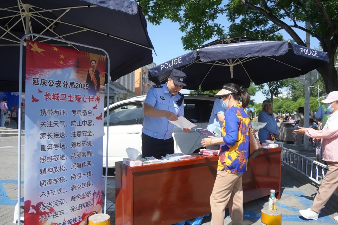 在考点附近,延庆警方还设置了“长城卫士暖心伴考”服务站,免费提供饮用水、药品、文具、扇子、雨伞、纸抽等;同时,准备了防范电信诈骗、预防交通事故等安全防范宣传品,随时为考生及家长提供服务和帮助。