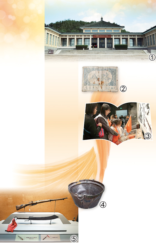 图①:八路军太行纪念馆外观。图②:八路军臂章。图③:观众在纪念馆内参观。图④:打满铁补丁的行军锅。图⑤:八路军使用过的步枪和砍刀。图①⑤均为本报记者郑海鸥摄 图②③④均为八路军太行纪念馆提供