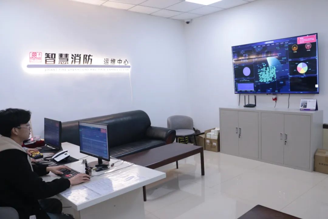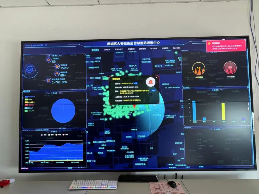 在煤市街21号一层的“智慧消防”运维中心,巨大的屏幕实时跳动着14000多个烟感设备的状态。设备在线率、报警响应时间等核心数据一目了然。