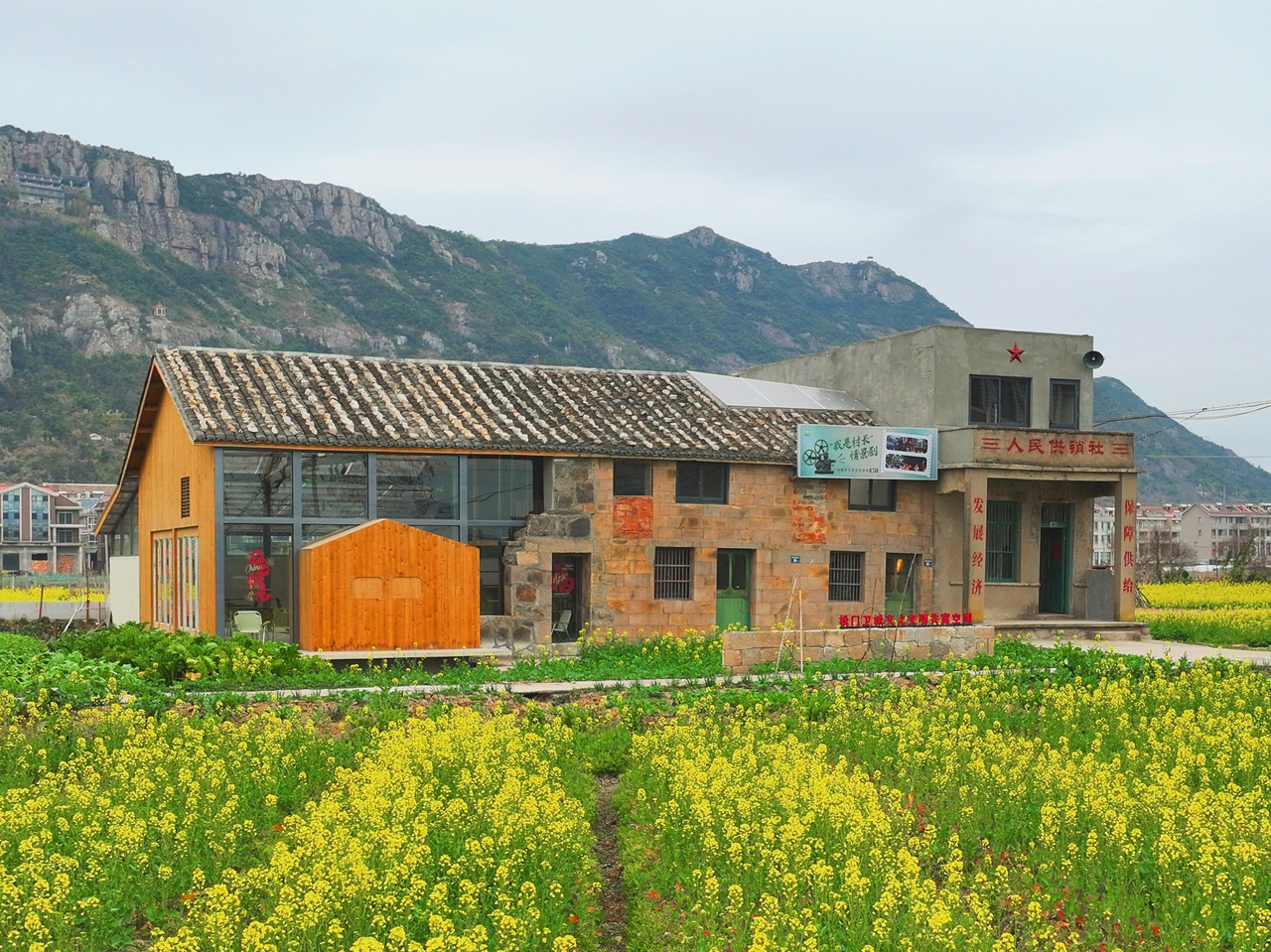 松门镇松建村里,一处老屋格外吸睛——几近倒塌的石墙原汁原味地保留,以玻璃衔接延伸,变身咖啡馆,入驻了非遗手作,还有艺术家常来办展。