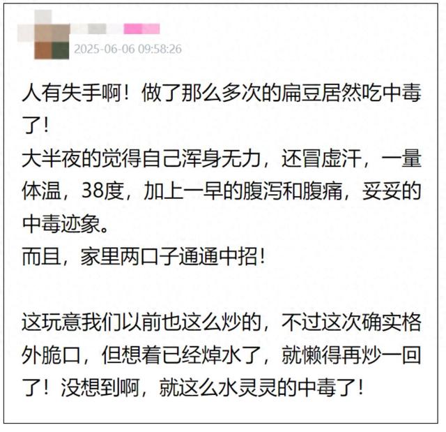 6月6日上午,杭州的叶女士发文称,做了那么多次的豆角居然吃中毒了,大半夜的时候觉得自己浑身无力,还冒虚汗,一量体温38℃,加上一早的腹泻和腹痛,妥妥的中毒迹象。