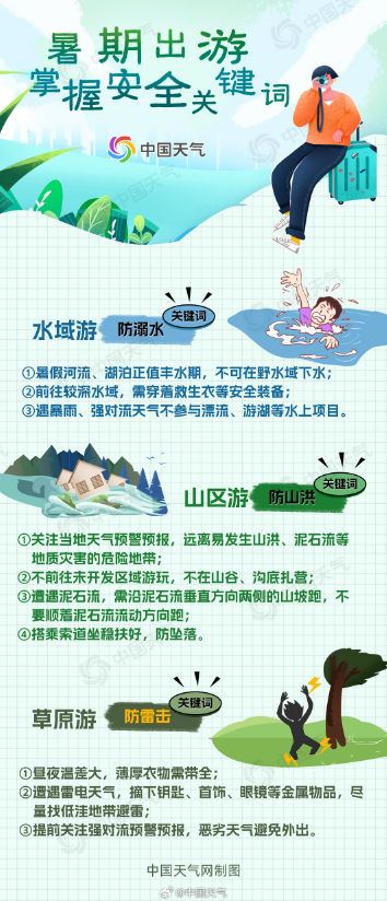 另外,暑期正值我国主汛期,掌握出游安全关键词,欢乐平安过暑假。