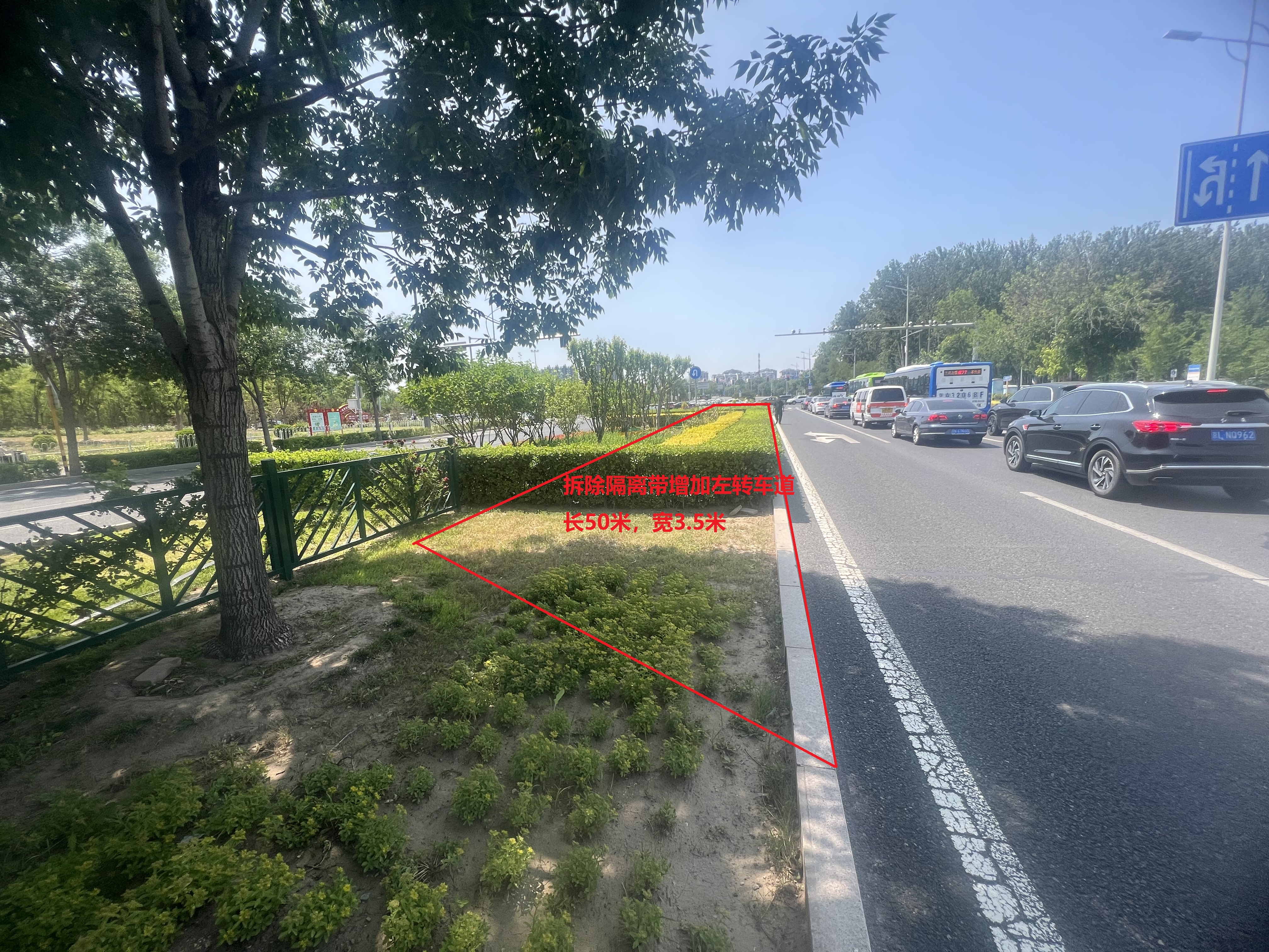 通顺路与复兴东街交叉口:针对早高峰通顺路与复兴东街交叉口北向南车辆多次出现排队至通顺路与复兴一街交叉口的状况,拟将通顺路北向南路口段的10米宽中央分隔带缩窄,拓宽出一条3.5米左转专用车道,将该路口渠化为5条车道,原有左转专用车道改为直行,缓解通行压力。