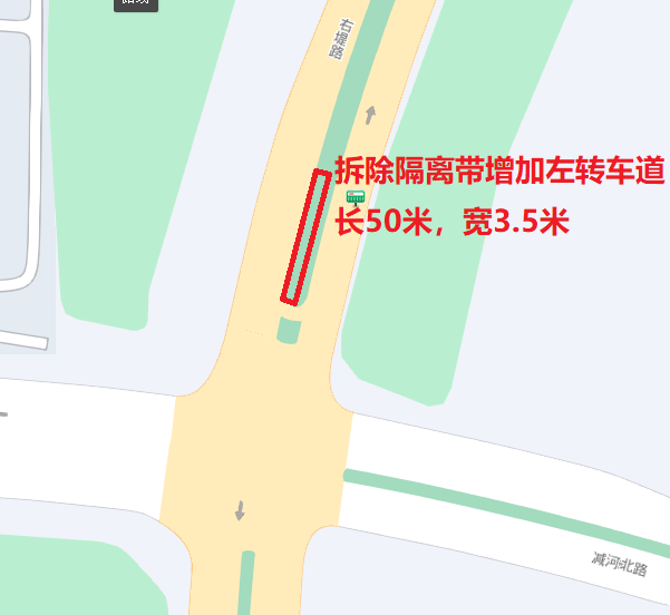 右堤路与复兴东街交叉口:早高峰复兴东街与右堤路交叉口右转车辆与直行车辆交织拥堵情况,拟将右堤路北向南方向的6米宽中央隔离带缩窄,拓宽出一条3.5米左转专用车道,将该路口渠化为5条车道,原有左转车道调整为直行,分流直行车辆,缓解通行压力。