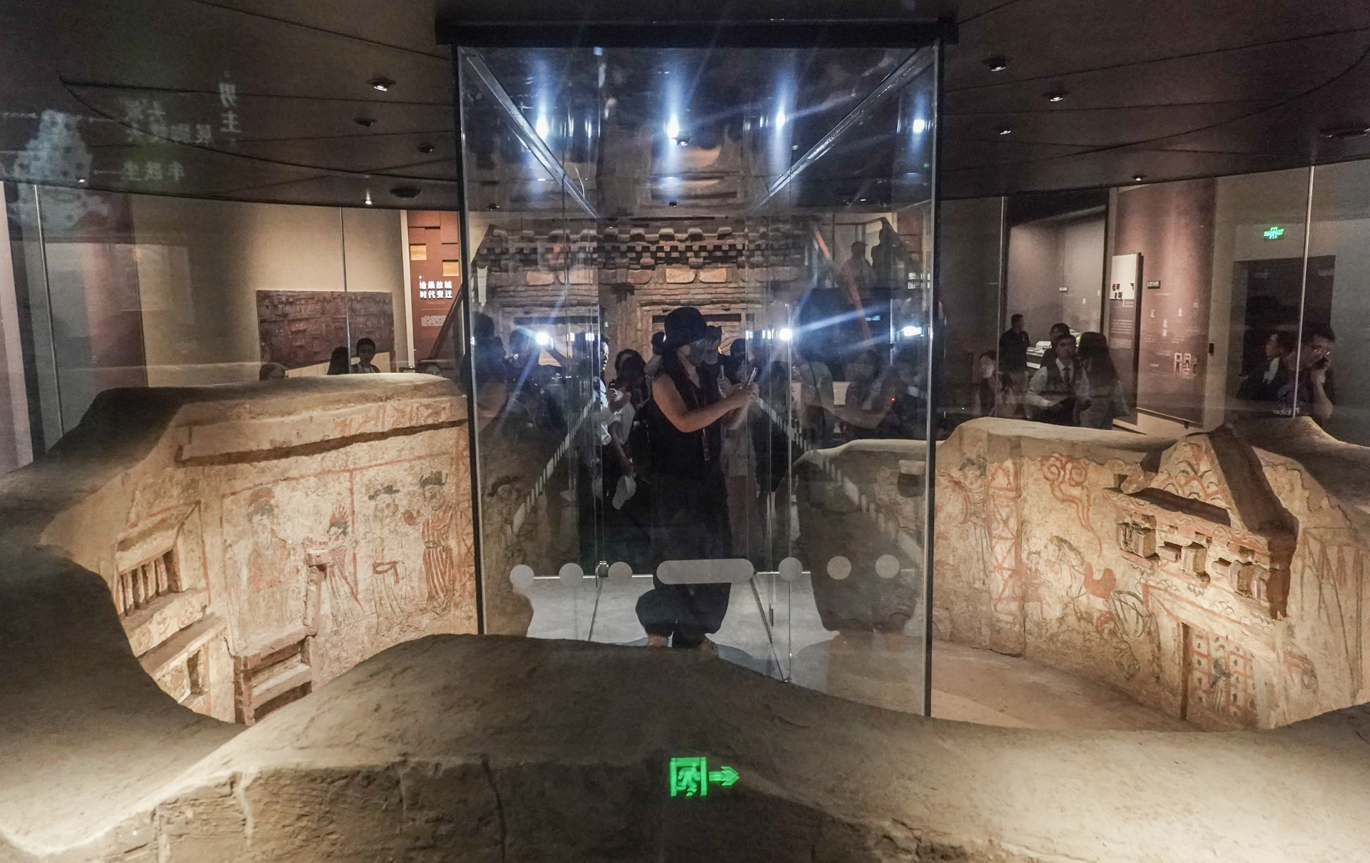 另一座金代壁画墓出土于2019年。登上景观台细看,四壁存有砖影和壁画,内容涉及墓主人夫妇宴饮图、妇人启门图、侍女点灯图、男仆备马图等,画面色彩丰富、笔触生动。“我们对壁画进行了全景式扫描、整体迁移保护,配合多媒体互动展示,反映辽金时期的社会生活状况。”刘乃涛说,一同展出的文物也均出自这座墓葬,有盆、盏、熨斗、壶、釜、剪子、簸箕等,它们与墓中的壁画一起,描绘了古人真实的生活场景。