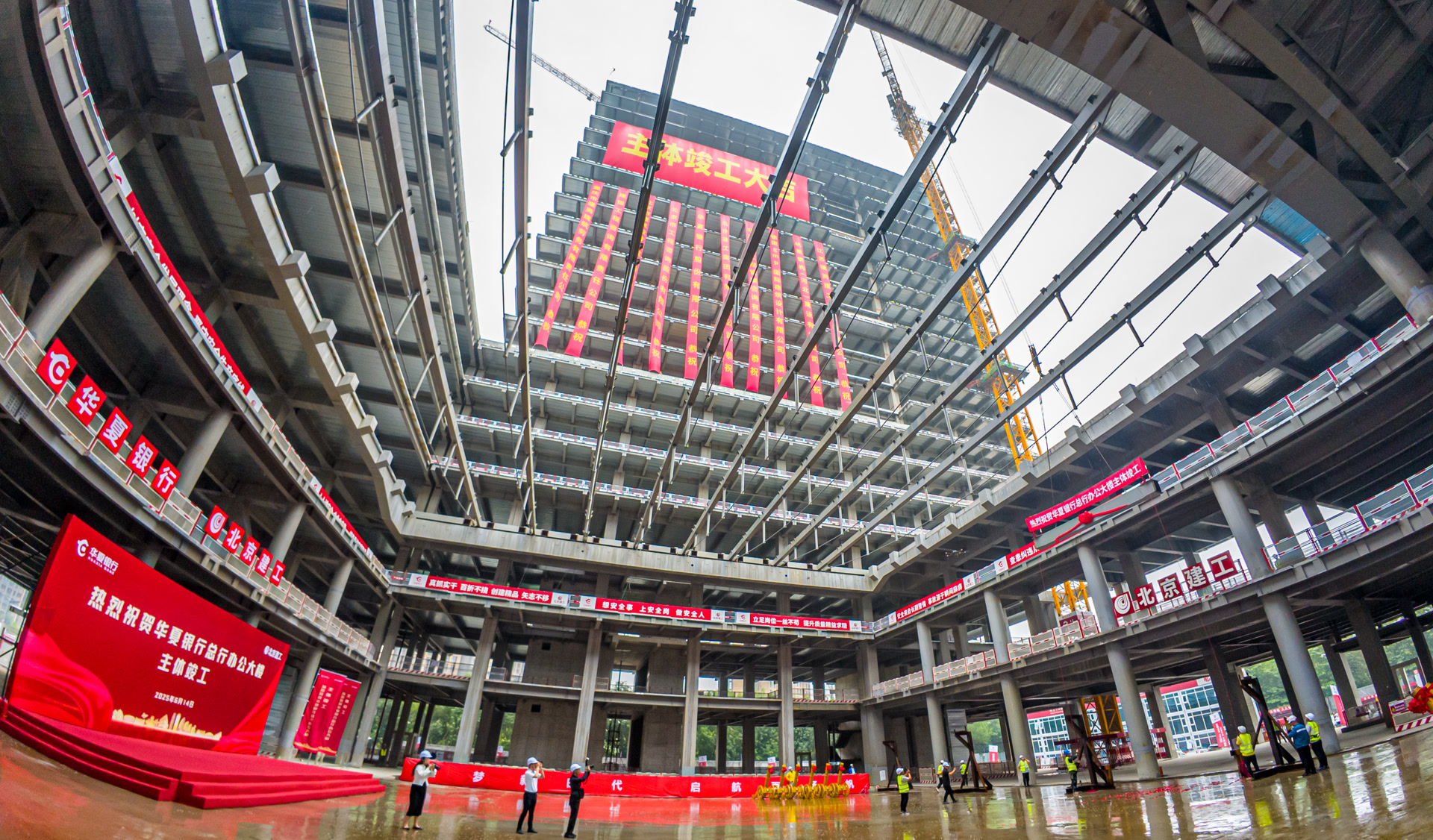 6月14日上午,随着最后一根钢梁稳稳升至99.95米高空完成焊接,华夏银行总行办公大楼在北京城市副中心顺利实现主体结构封顶,比原计划提前了45天。这座大楼投资27亿元,总建筑面积超19万平方米,是当前副中心投资最高、体量最大的市属国企总部大楼,预计今年年底实现外立面亮相。