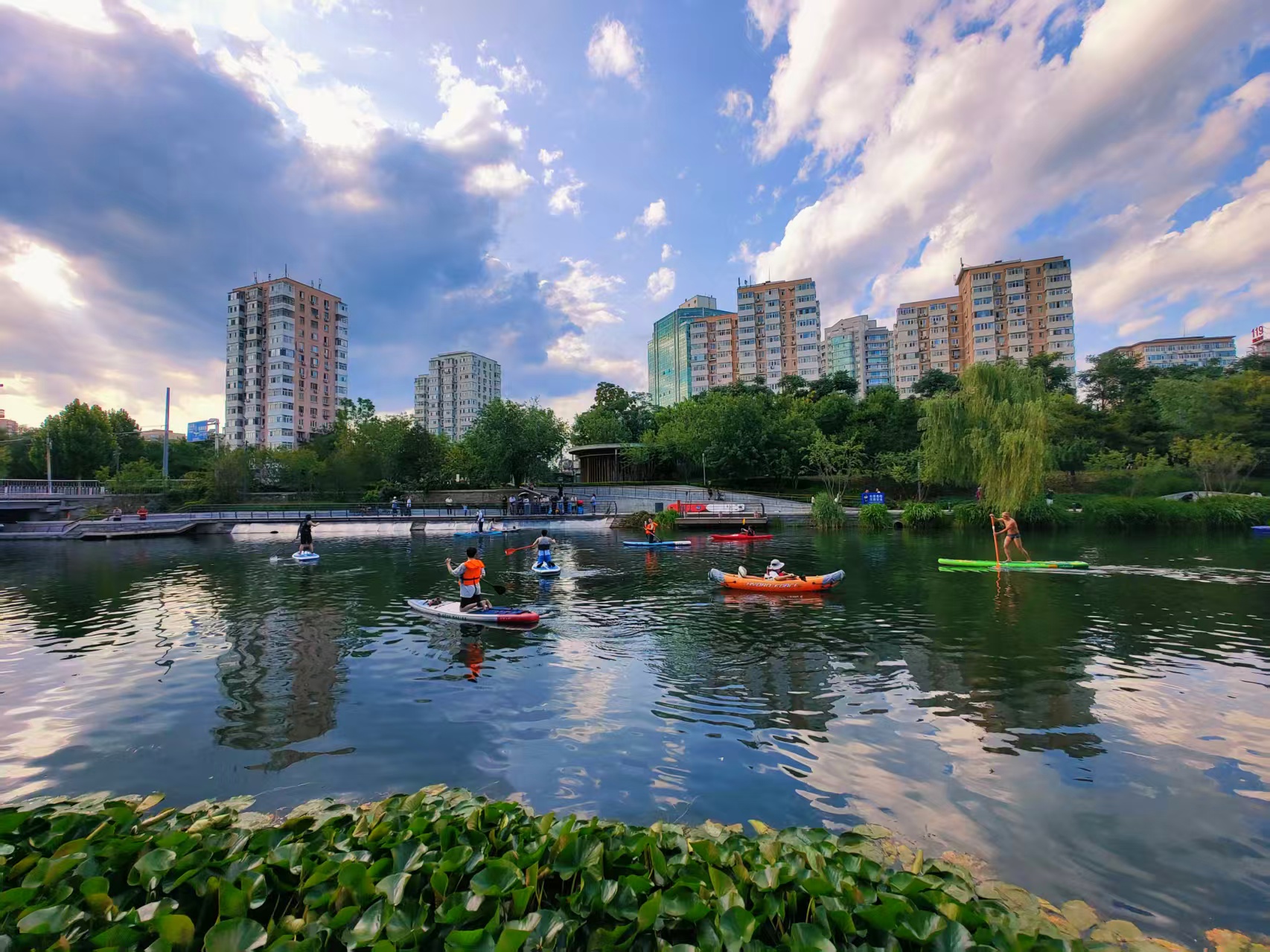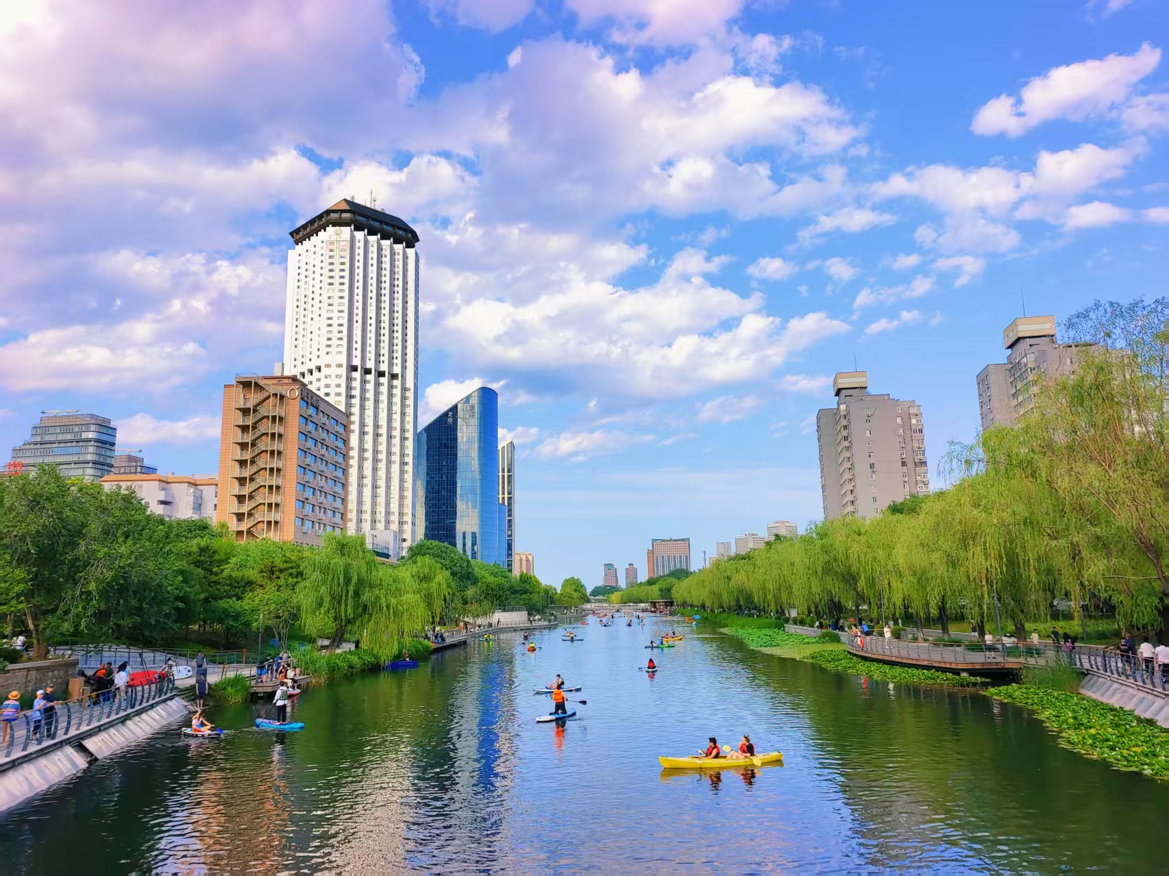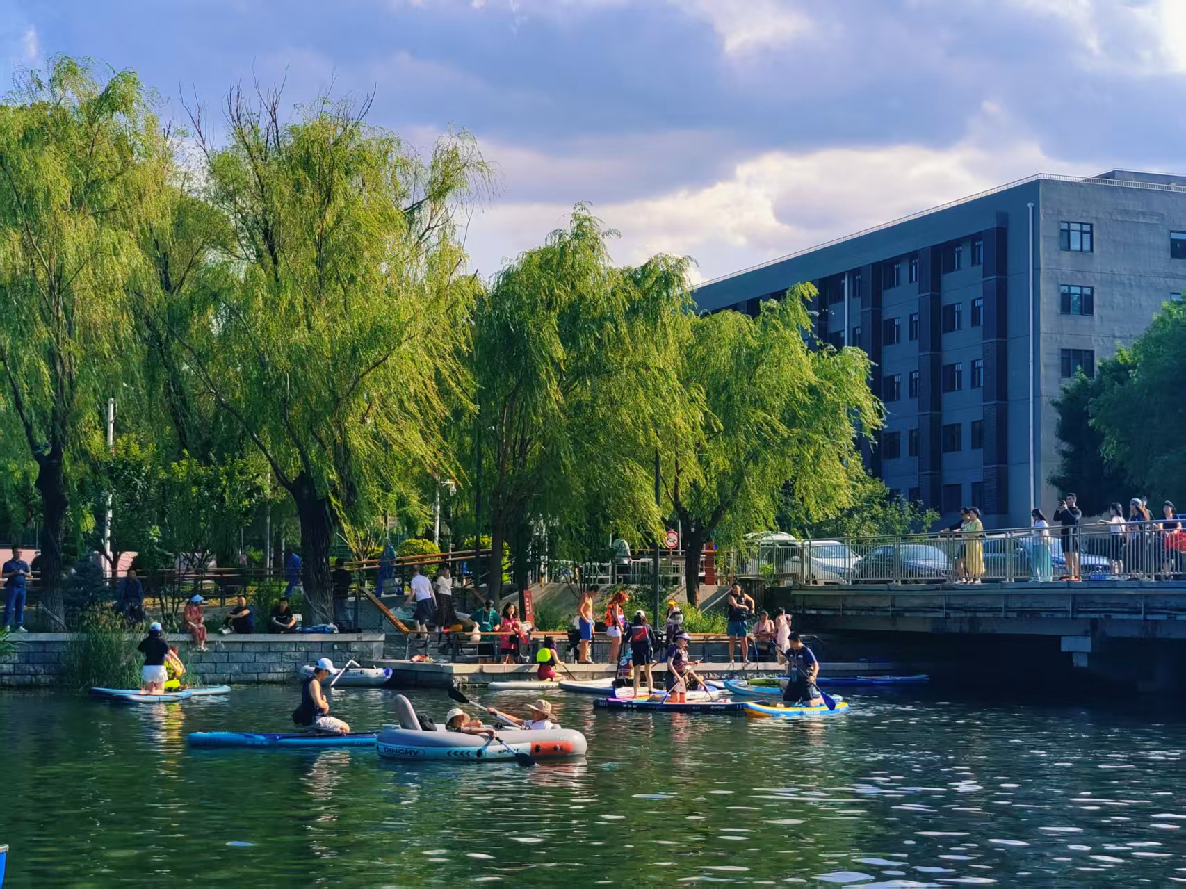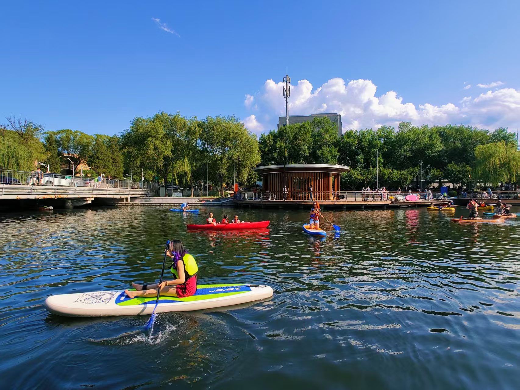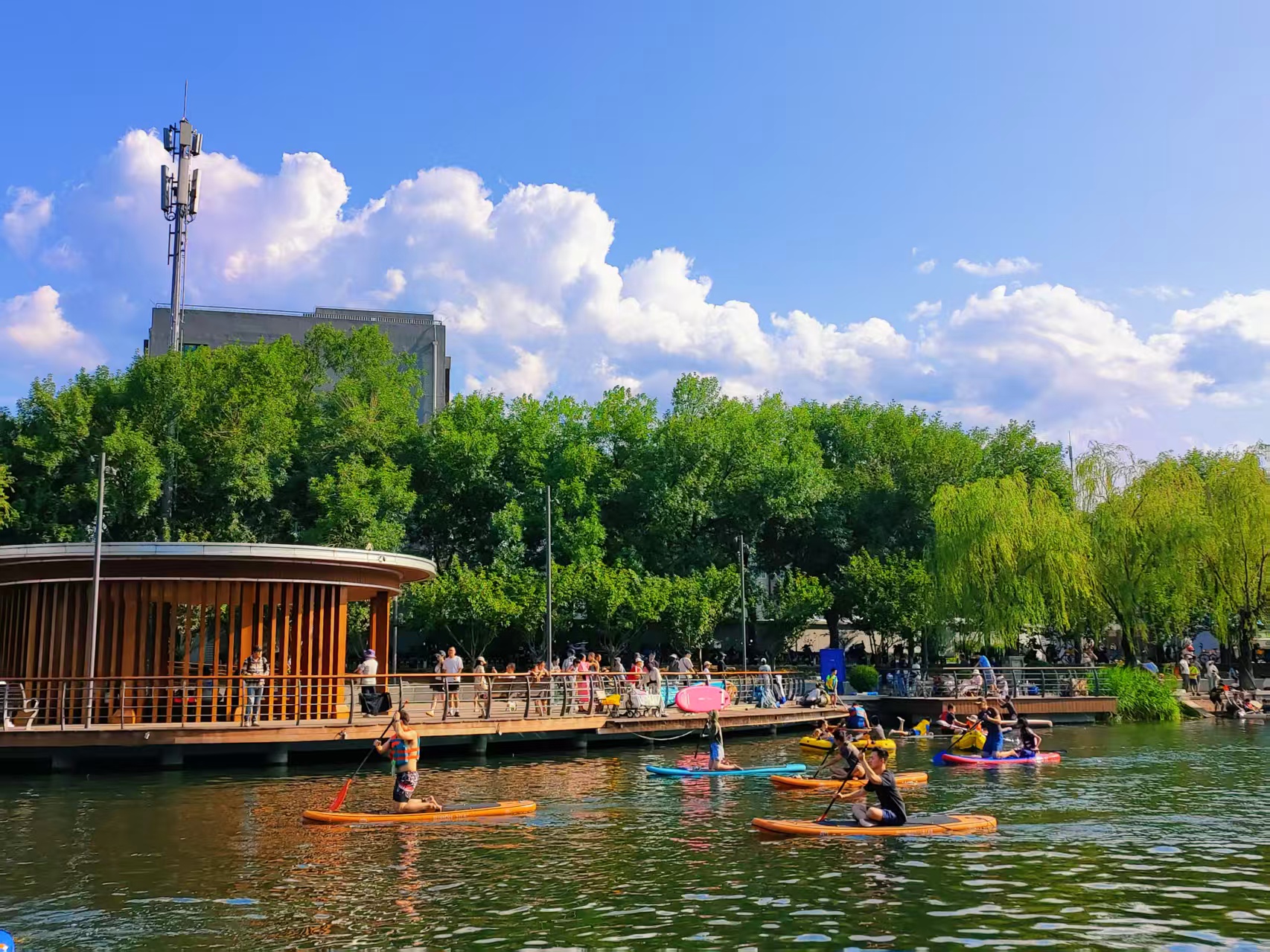 当盛夏的骄阳为城市镀上一层金边,亮马河风情水岸两侧绿树成荫,似一条翠绿的绸带,温柔地环抱着蜿蜒的河道;河中,小帆板如灵动的白蝶,在波光粼粼的水面上尽情嬉戏,留下一串串欢快的涟漪。这里,是自然与都市交织的梦幻之境,吸引着无数人前来打卡,沉醉于这份独有的夏日浪漫。