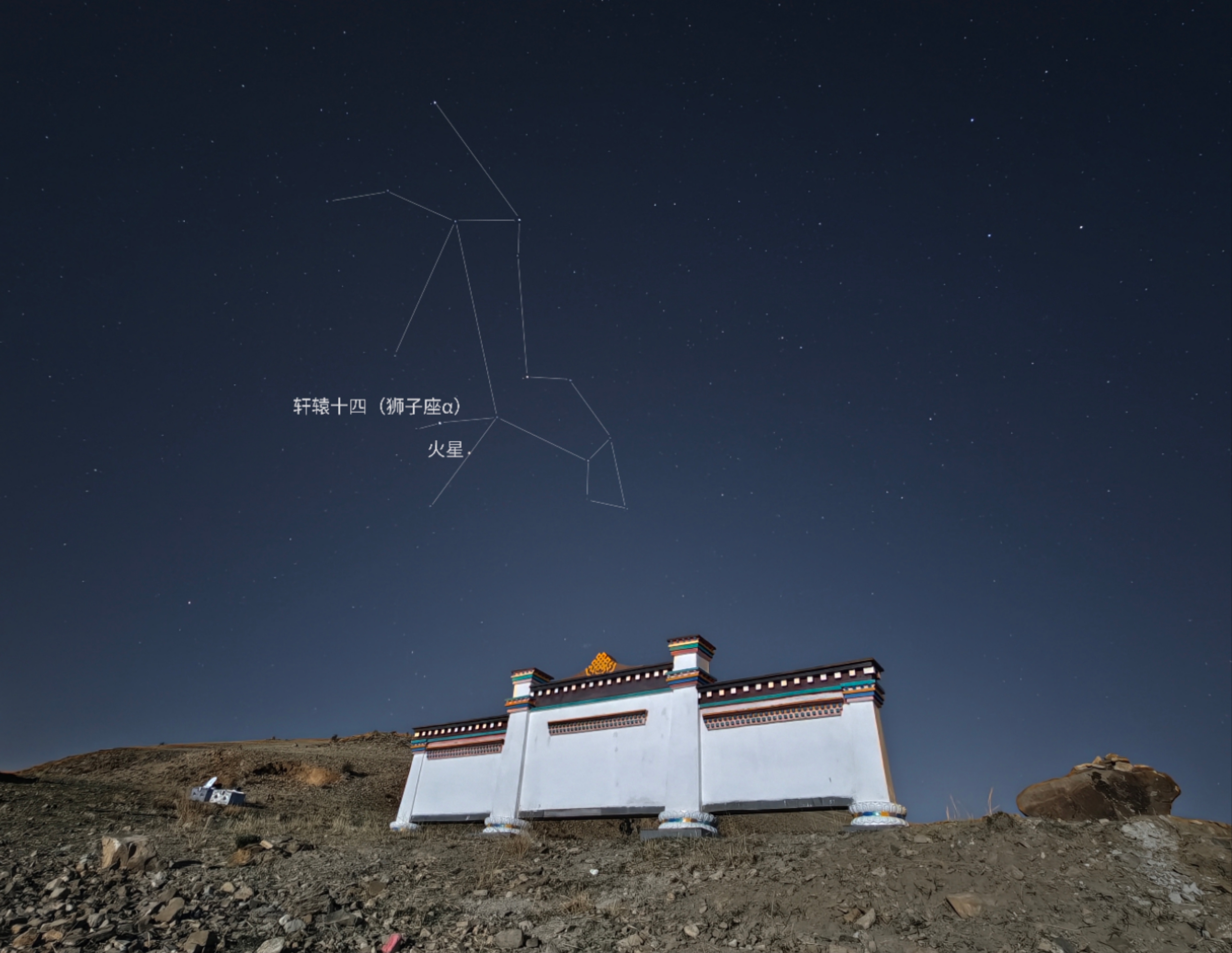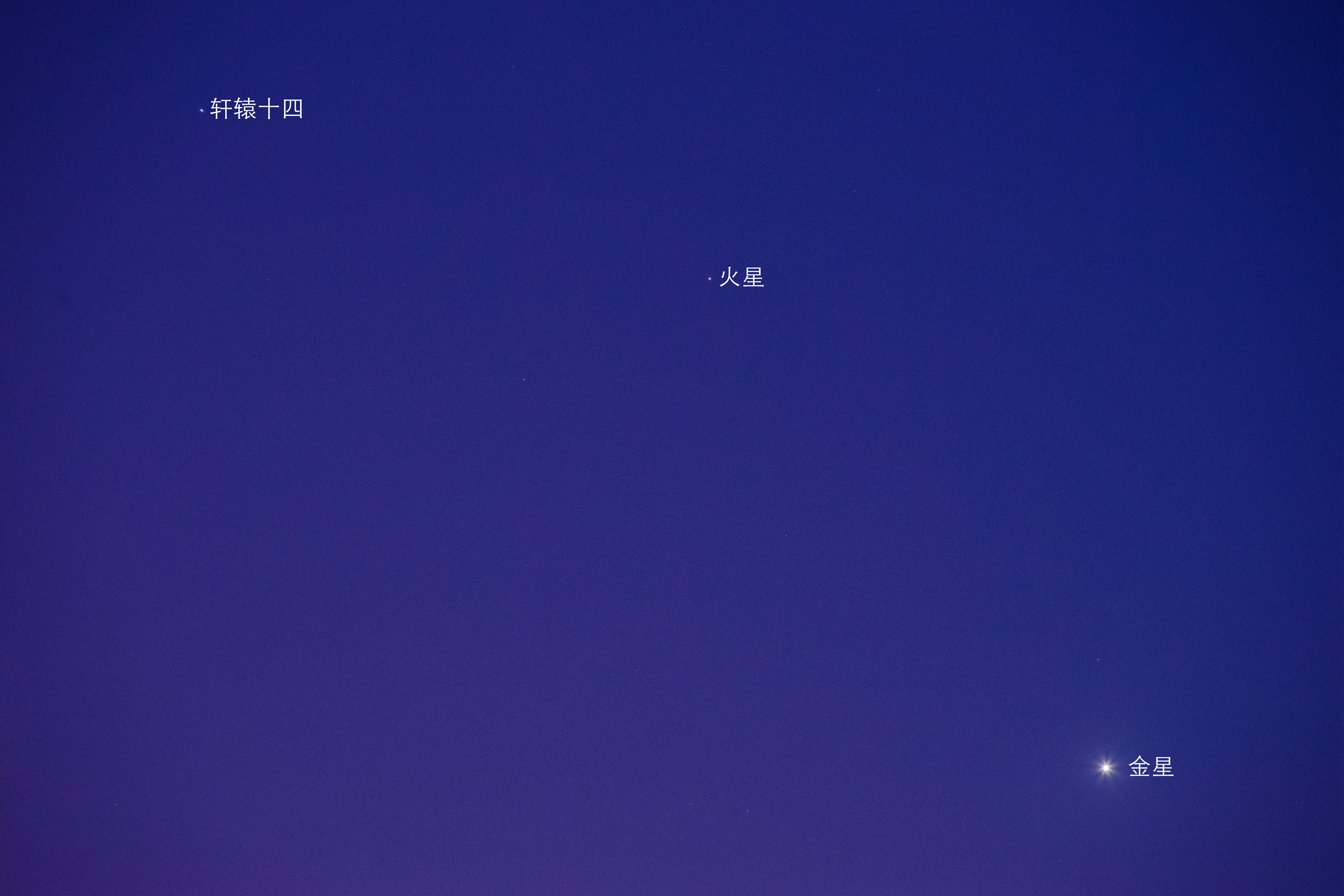 火星与轩辕十四亮度皆为约1.3等,亮度相近但颜色各异,橙红的火星与蓝白色的轩辕十四在夜空中相互辉映,构成了一幅美妙的天文画卷。如果使用双筒望远镜观看,效果更佳。