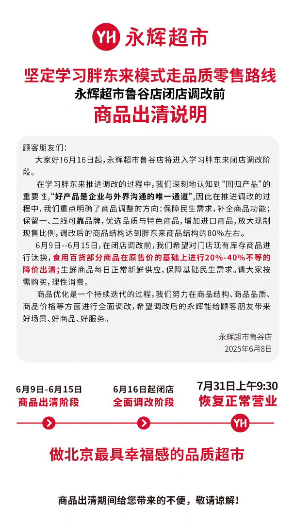 大家好!6月16日起,永辉超市鲁谷店将进入学习胖东来闭店调改阶段。