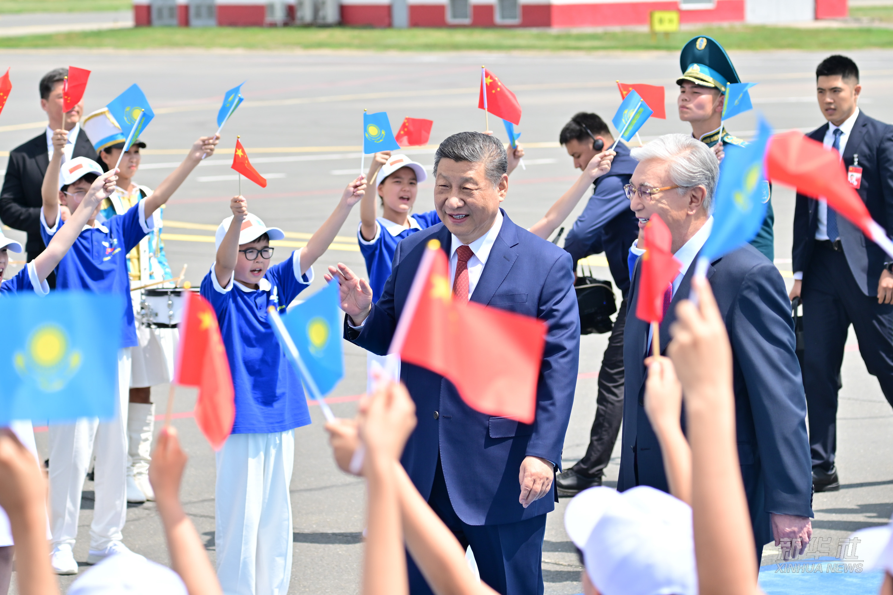 当地时间6月16日中午,国家主席习近平乘专机抵达阿斯塔纳,应哈萨克斯坦共和国总统托卡耶夫邀请,出席第二届中国-中亚峰会。