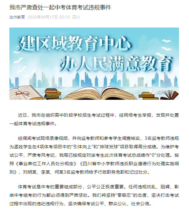 “3名监考教师违规为孟姓学生在4项体考项目中的‘引体向上’和‘排球发球’项目取得高分成绩;我局已按规定对该考生此次体育考试总成绩作0分处理,对胡某、李某、何某3名监考教师给予行政职务免职和记过处分”。6月17日,四川达州市教育局通报的一起中考生体考作弊事件,引发广泛关注。