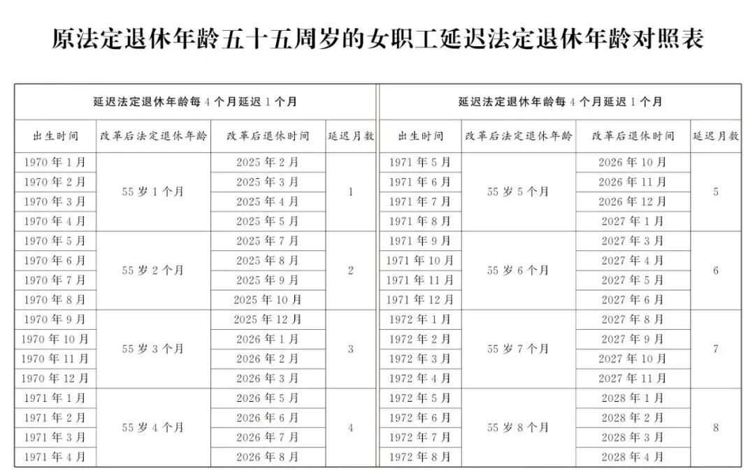 从2025年1月1日起,原法定退休年龄为五十五周岁的女职工法定退休年龄每四个月延迟一个月,逐步延迟至五十八周岁。