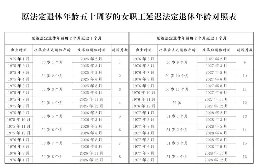从2025年1月1日起,原法定退休年龄为五十周岁的女职工,法定退休年龄每二个月延迟一个月,逐步延迟至五十五周岁。