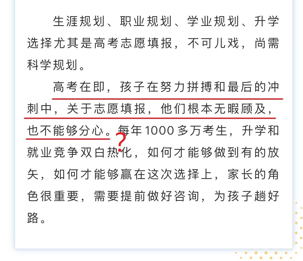 但记者也看到,“阳光志愿”平台虽然是免费提供给考生,功能也十分强大,但也正因为功能较多,家长和学生使用起来还是需要一定的学习和时间成本。市面上有机构在打广告时,似乎也抓准了有些家庭怕麻烦的心理,“如果因为工作忙没时间研究报考的家长,抓紧联系我们……”