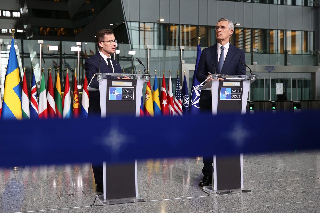 2024年3月11日,在位于比利时布鲁塞尔的北约总部,瑞典首相克里斯特松(左)和时任北约秘书长斯托尔滕贝格出席联合新闻发布会。北约当日在其位于布鲁塞尔的总部举行瑞典加入北约仪式。新华社记者赵丁喆摄