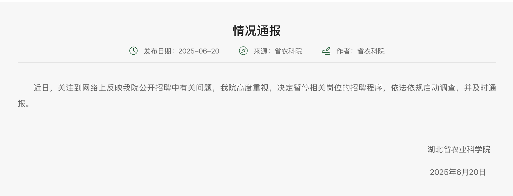湖北省农业科学院6月20日发布情况通报称,近日,关注到网络上反映我院公开招聘中有关问题,湖北省农业科学院高度重视,决定暂停相关岗位的招聘程序,依法依规启动调查,并及时通报。