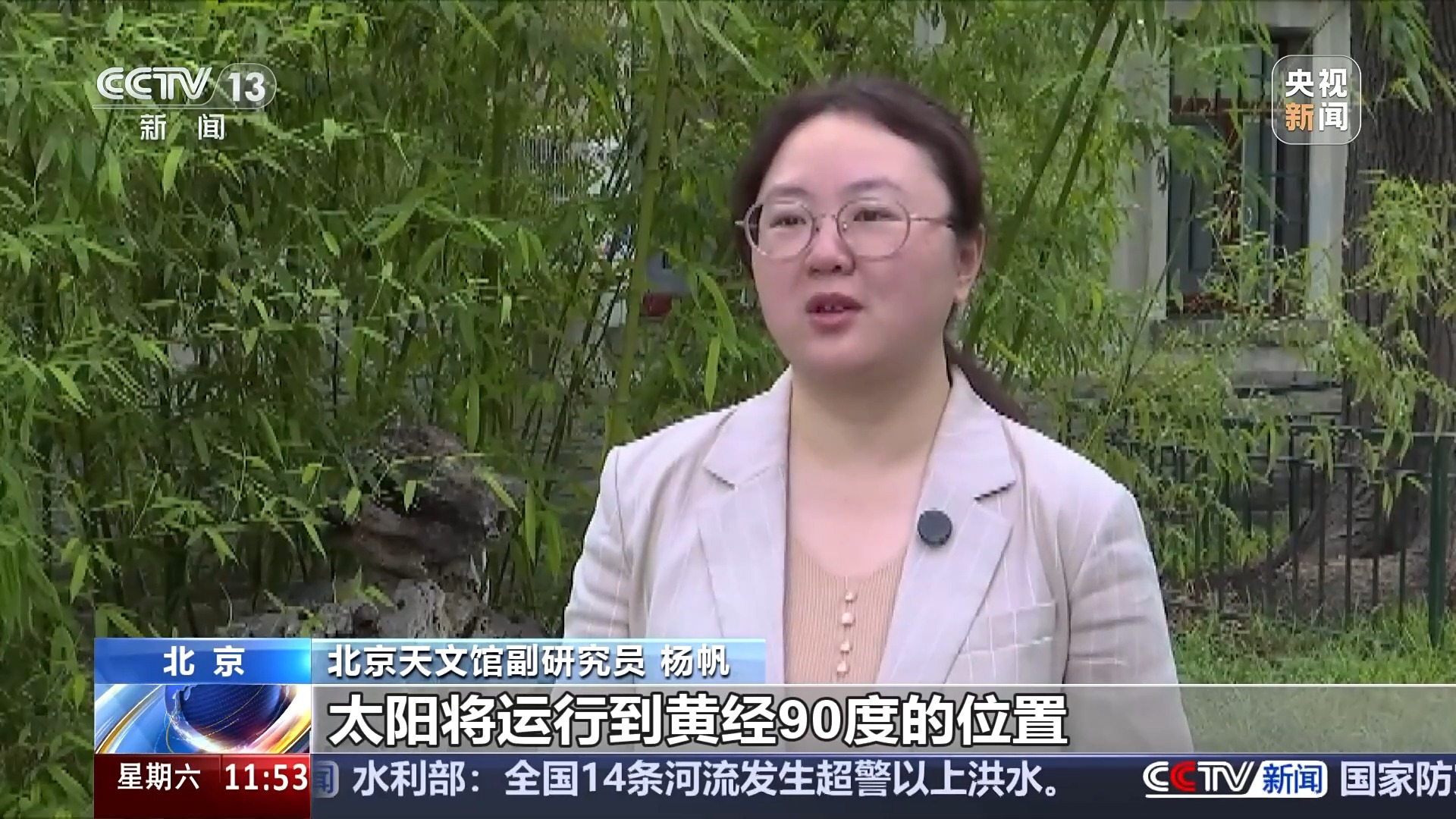 北京天文馆副研究员 杨帆:今年夏至的时间是6月21日上午10:42,这个时候,太阳将运行到黄经90度的位置。