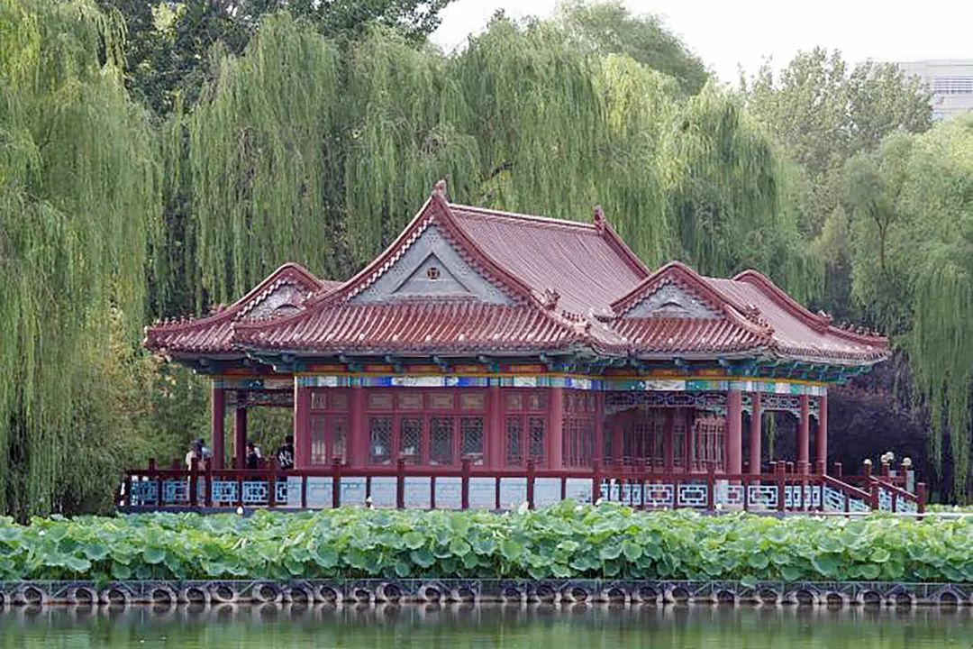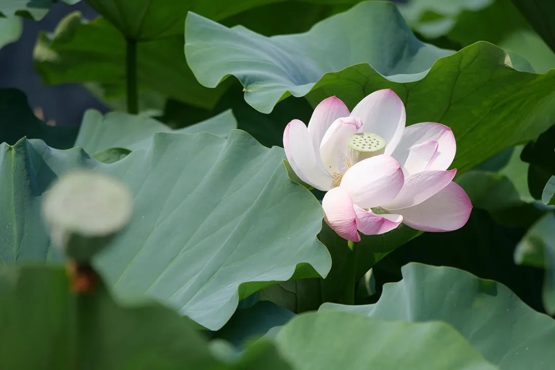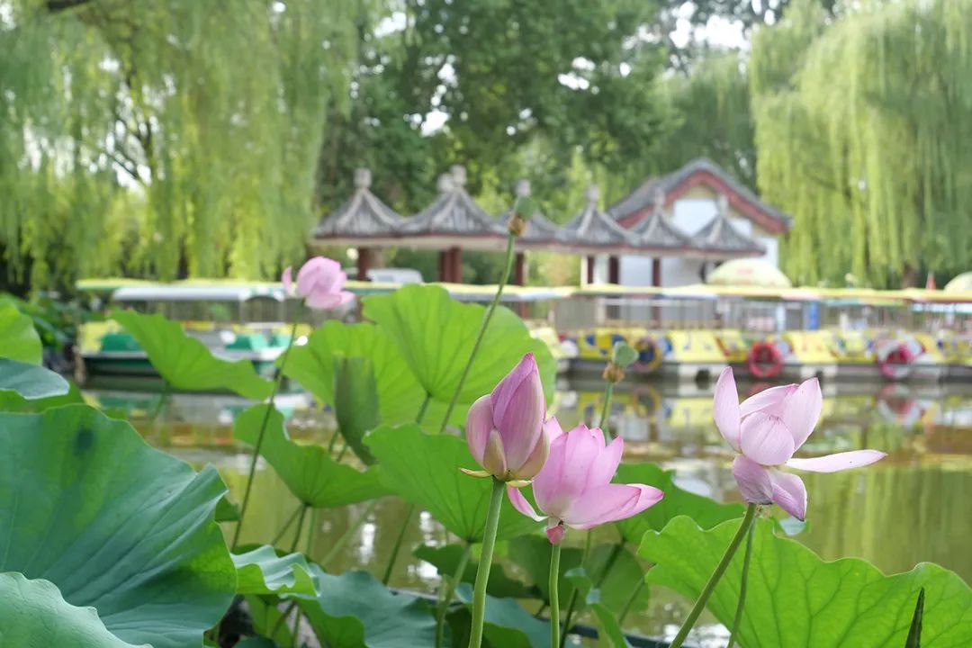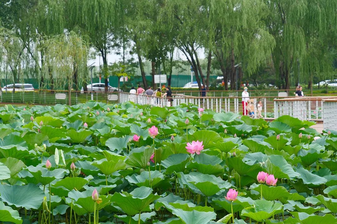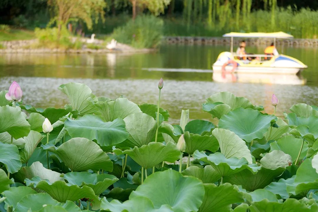 顺义公园里的荷花已零星绽放,粉白的花瓣在阳光下闪耀着柔和的光芒。荷叶密密匝匝,有的平铺在水面上,有的高高挺立,宛如一把把翠绿的小伞。