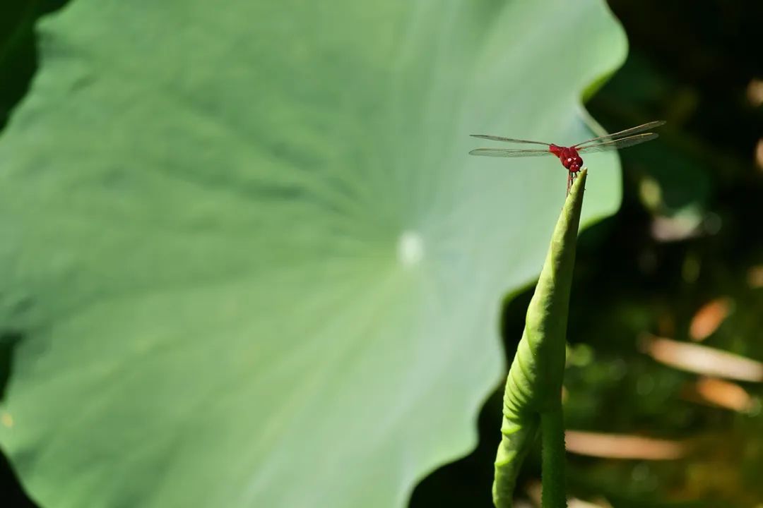 湖中,蜻蜓轻点水面,留下一圈圈转瞬即逝的涟漪,与荷花、荷叶相映成趣,共同谱写夏日的乐章。