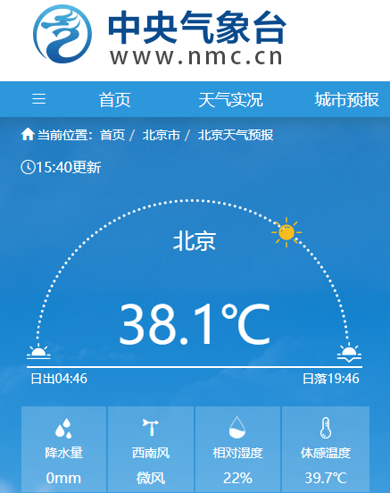 今天截至(6月22日)15:40,北京最高气温达到38.1℃,为今年以来气温新高。预计23日至25日,北京还将出现35℃以上的高温热浪天气,请注意防暑降温!