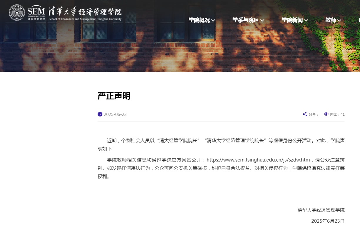 近期,个别社会人员以“清大经管学院院长”“清华大学经济管理学院院长”等虚假身份公开活动。对此,学院声明如下: