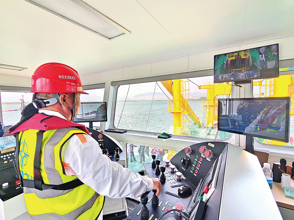 “浚澜”船调试期间,付海宏每天总会在驾驶舱内待上很长一段时间,目不转睛地盯着舱内的大屏幕。“随着设备运转,挖掘效率、输送流量、轮机运行等各项参数都会同步显示在屏幕上,哪儿出现什么问题一目了然。”让他不禁点赞的,还有完成作业任务后的“成果小结”,“能够自动显示排距、产量,都不用人工再去计算,十分方便。”