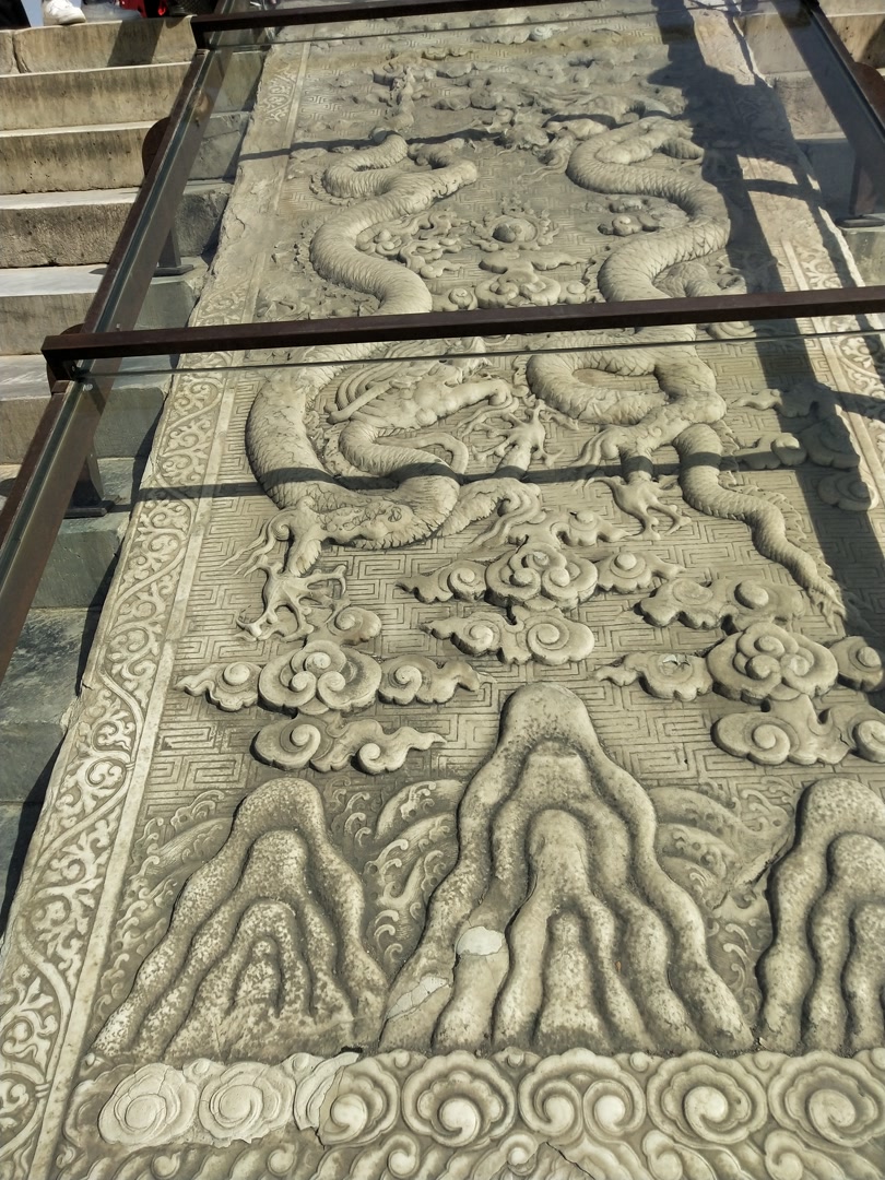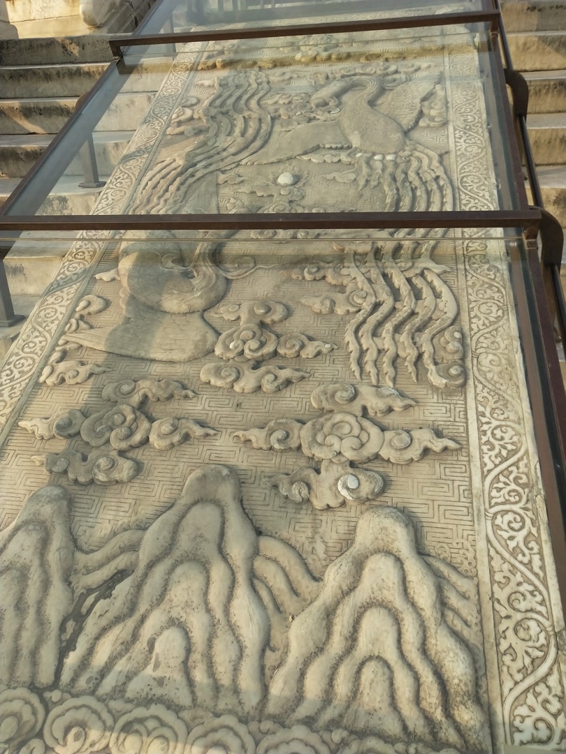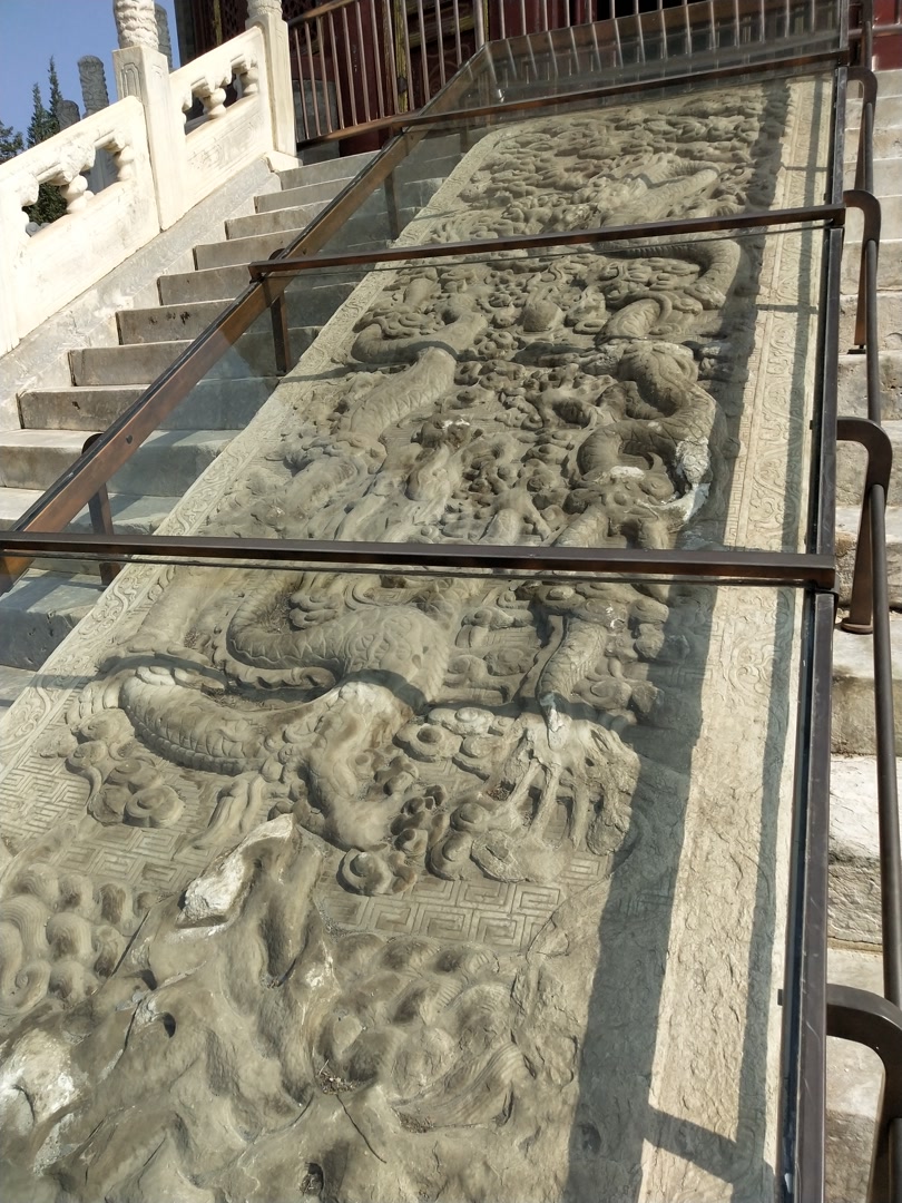 丹陛石又称陛阶石,或“御路石”,是古代宫殿门前台阶中间镶嵌的那块长方形大石头,一般是一整块石头,有的还由好几段石头组成。丹陛石是中国帝王身份的象征。石头上镌刻有不同的图案,有江崖海水、祥云、双龙、双凤、龙凤、海狮、海马等。北京天坛的丹陛石,我们屈指可数看得见的有十座。其中祈年殿坛基出陛间南北御路各3座,祈年门出陛间南北御路各1座,皇穹宇南向出陛间御路1座,斋宫无梁殿东向出陛间御路1座。