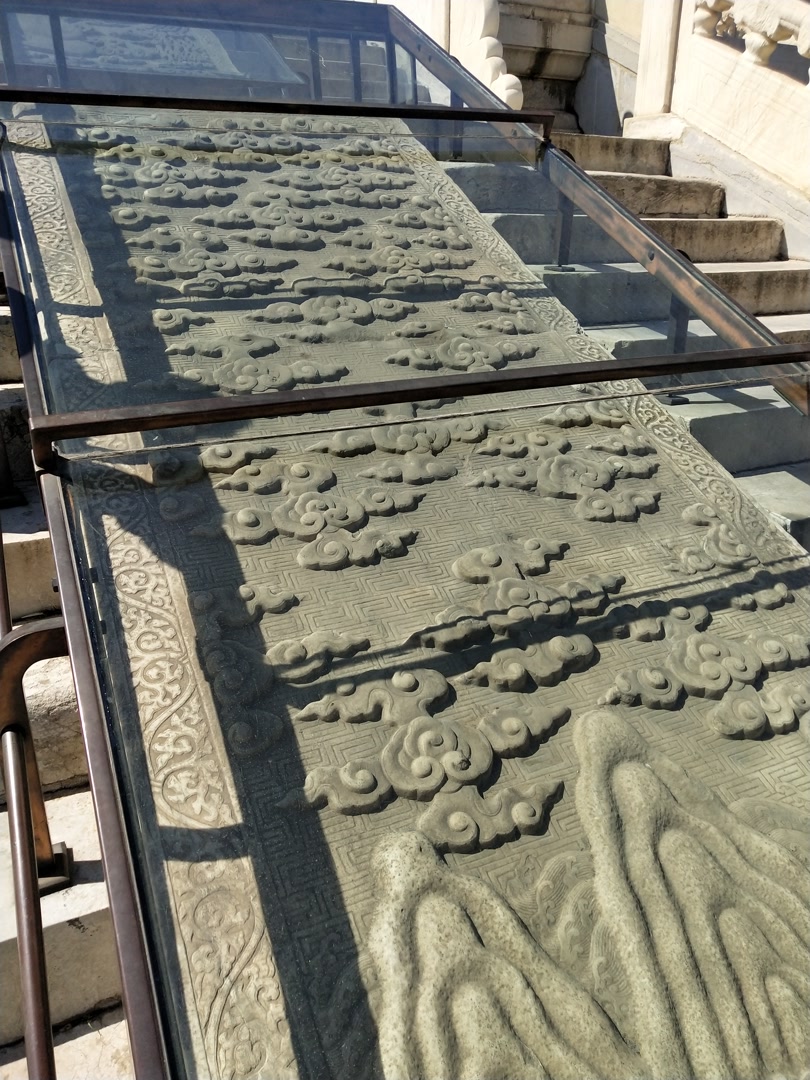其实,天坛里还有4座丹陛石,是我们不得看见的。那么这4块丹陛石究竟在天坛的哪儿呢?2006年北京出版社出版,姚安主编的《北京志·世界文化遗产卷·天坛志》第一篇第三章“斋宫”第一节“御河 钟楼”写到:“斋宫东门是斋宫 的正门,为砖座垂脊拱券式宫门,面阔15.63米,进深6.72米,门前有白玉石桥,门内外设以阶,枕以御路,护以雕栏。”为保护这4座“御路石”,同时便于游客从“御路门”进出游览,采取了用黑色塑胶板覆盖措施。原来他们就在您的脚下。