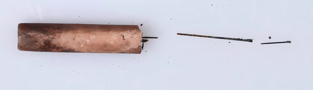为最大限度保证文物安全,研究人员未将针状物全部取出,仅以某段玉管残件和在文保清理过程中从玉管断处掉落的针状物残件为样本进行检测分析,发现其为锻造的炒钢制品,截面直径仅为0.3至0.5毫米。