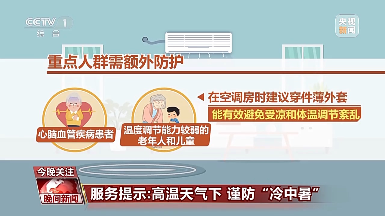 此外,重点人群需额外防护:心脑血管疾病患者,以及温调节能力较弱的老年人和儿童,在空调房时建议穿件薄外套,能有效避免受凉和体温调节紊乱。
