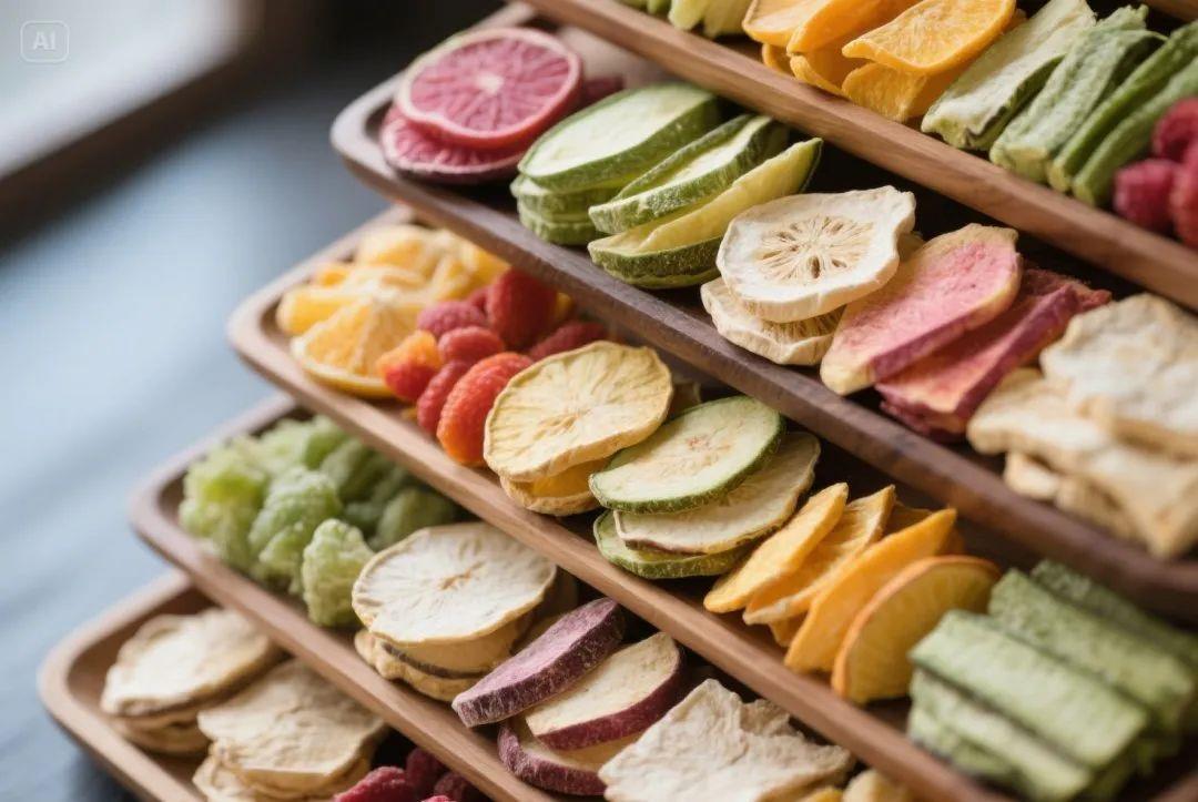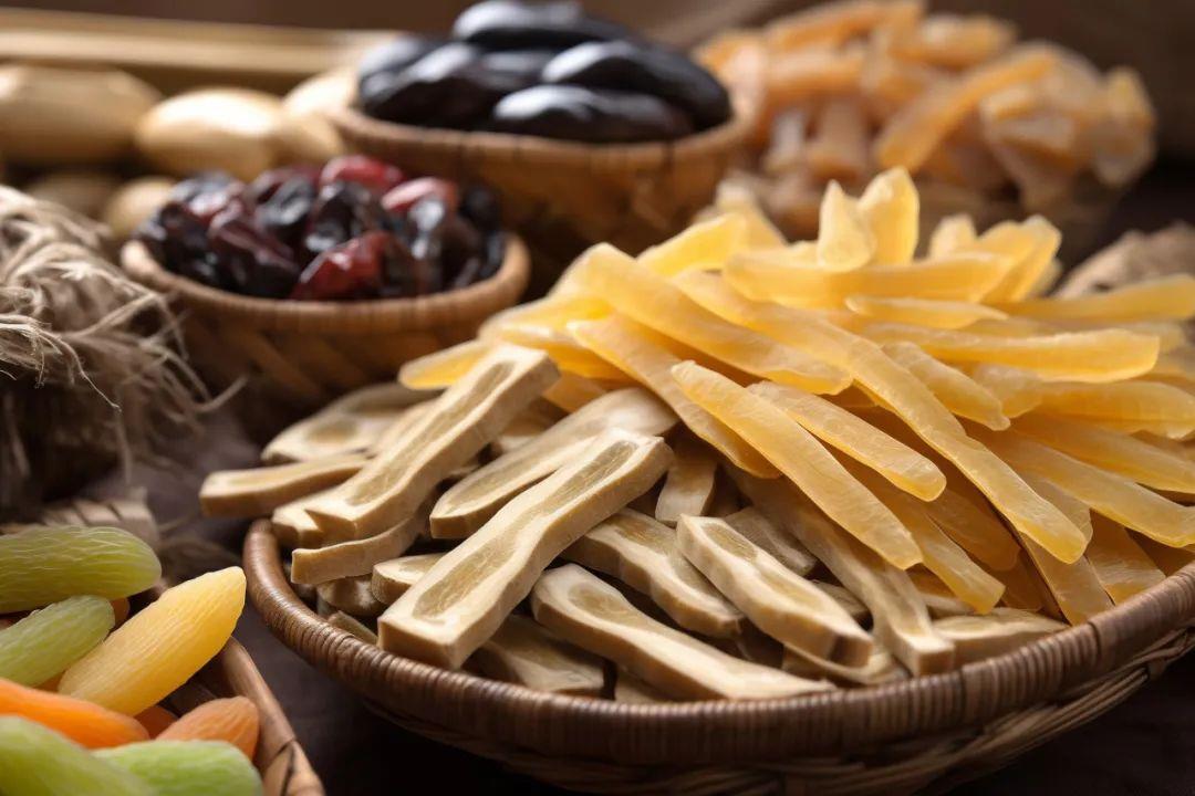 1、油炸脱水的果蔬干往往表面略带光泽,摸起来稍微硬实。