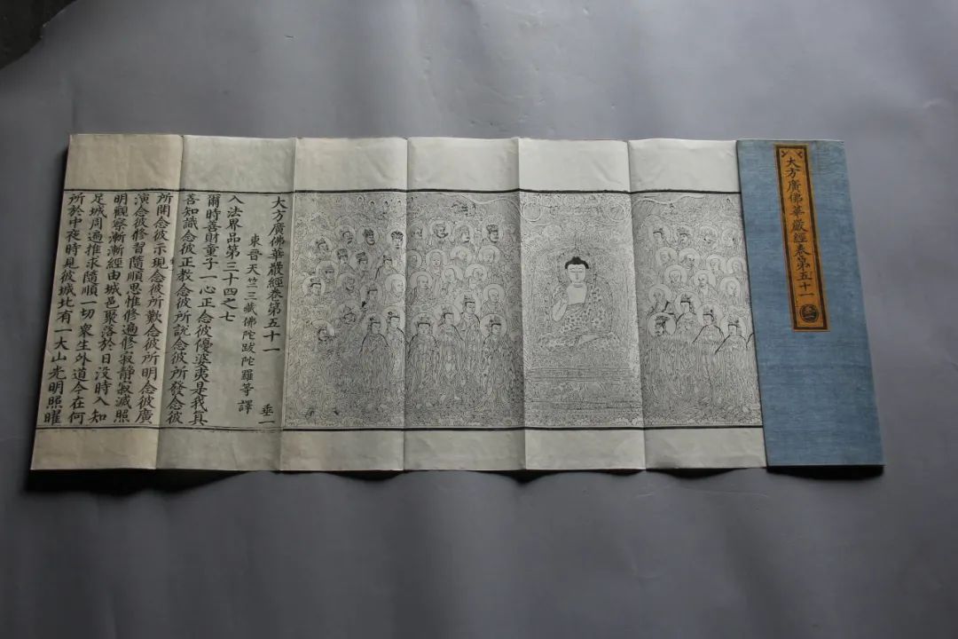 明北藏的经文字体采用元代大书法家赵孟頫的正楷,字体圆润清秀、笔画规整,兼具艺术性与可读性,充分体现了皇家审美与对藏经品质的高要求。每卷经文前的扉画和图像按经文内容绘制,由宫廷画师运用唐代吴道子创造的细纹白描技法,线条细腻流畅、形象生动逼真,在明代版画史上地位重要,比后来的徽派、浙派版画早百余年。而且其装帧考究,从纸张选择到装订工艺都尽显皇家风范。