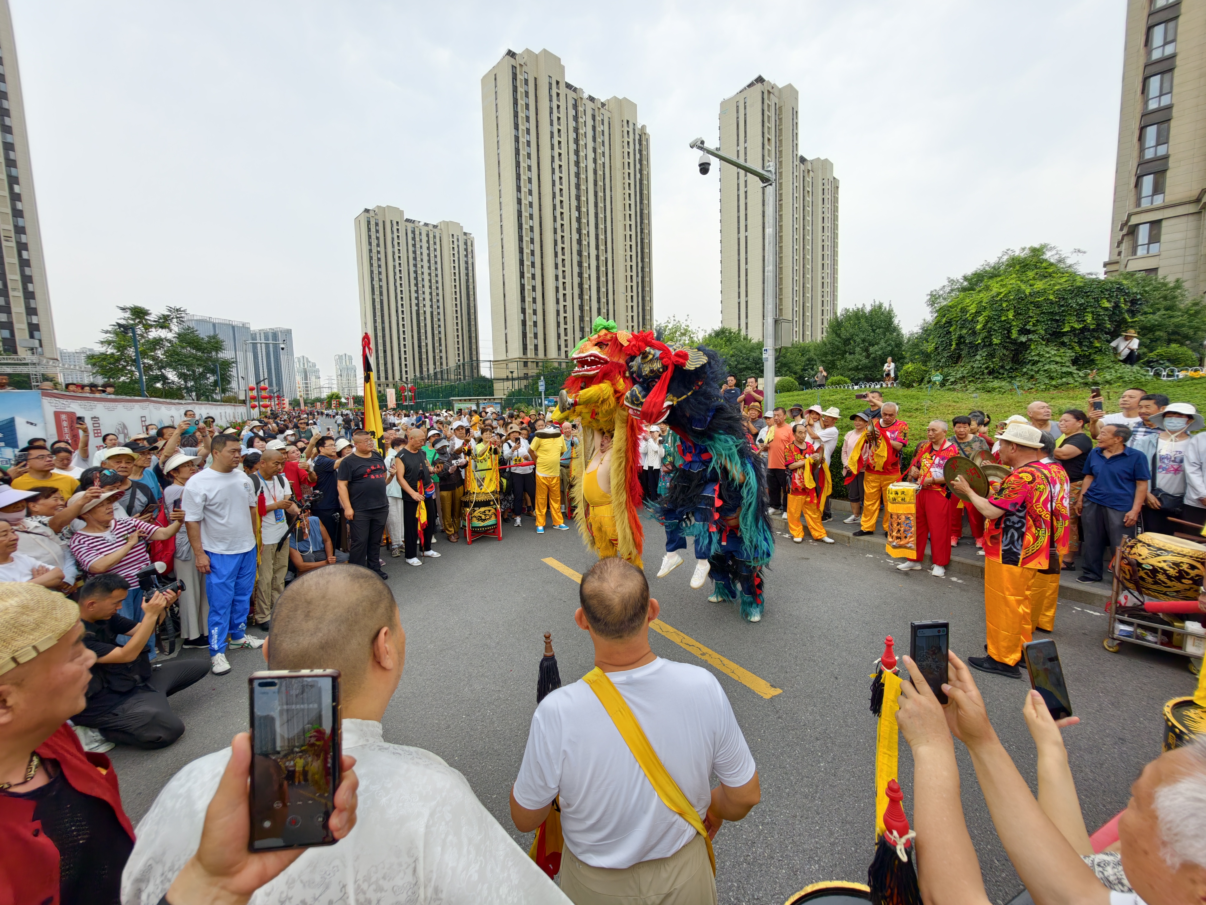 中顶庙前,十面大鼓整齐陈列,随着高亢号子划破长空,西铁营村“一统万年大鼓老会”的鼓手们迅速就位,鼓槌落下,似万马奔腾过草原。16名少年紧跟其后,手中花钹翻飞,清脆的响声与八个龙头宸子的叮当声交织,将非遗古韵展现得淋漓尽致。国家级非遗传承人更是化身“文化导师”,手把手带居民体验击鼓乐趣,传承非遗文化。