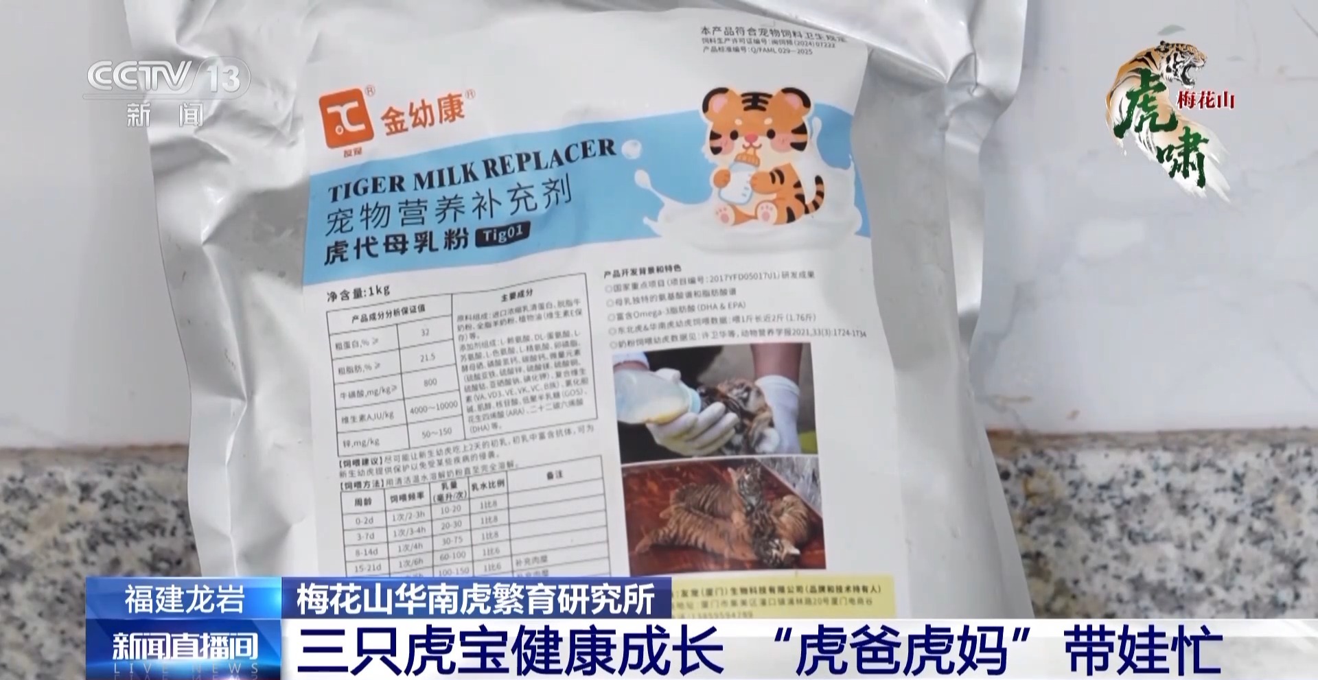 梅花山华南虎繁育研究所还专门为虎宝宝们研发了虎奶粉。它提取了华南虎的乳汁成分,以羊奶和牛奶粉作为主要原料,还添加了各种维生素、矿物质和氨基酸,不仅是我国首款老虎代育哺乳奶粉,还适用于所有的食肉动物,现在,全国十多家猛兽幼儿园都在使用。