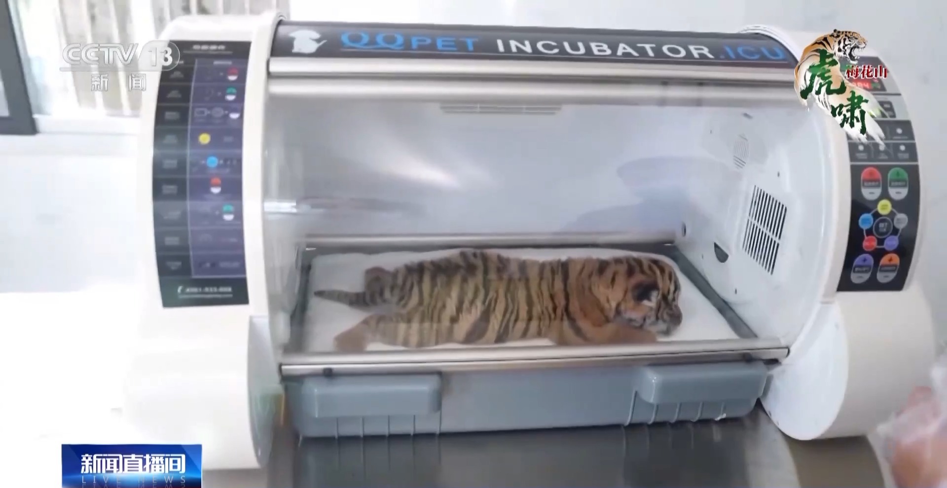 梅花山华南虎繁育研究所兽医师 陈腾腾:由于这只母虎是第一次当妈妈,在生产后期,胎儿头露出来又缩回去,整个生产过程还是比较艰难的。