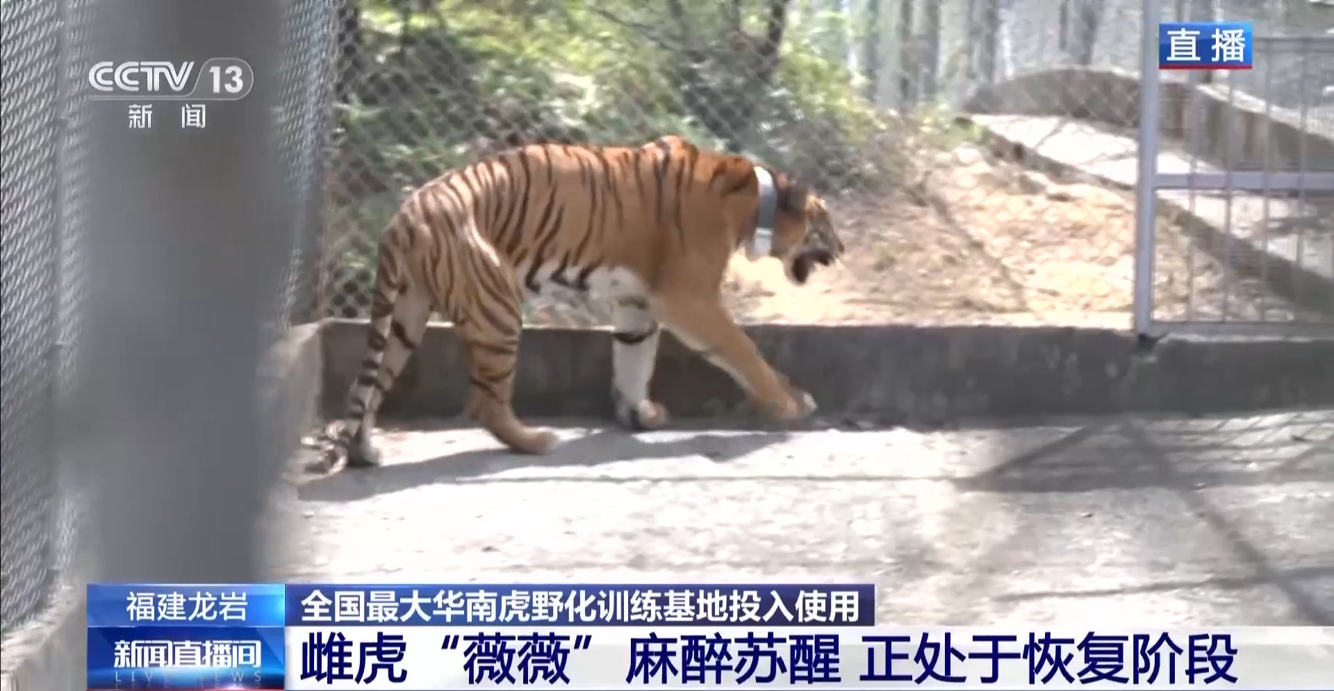 记者跟随着“凛凛”,从虎舍转移到了它的新家,也就是今天(26日)正式启用的野化训练基地。工作人员刚把“凛凛”送抵到这里的缓冲区,目前它还处于麻醉状态。为了后续能更好地观测“凛凛”在适应场内的活动情况,在麻醉苏醒之前,工作人员要给“凛凛”佩戴一个北斗定位项圈。接下来,工作人员还要给“凛凛”注射麻醉剂的解药,让它苏醒过来。随后,所有人员就要立刻退出缓冲区,把门锁好,在安全区域进行观察。