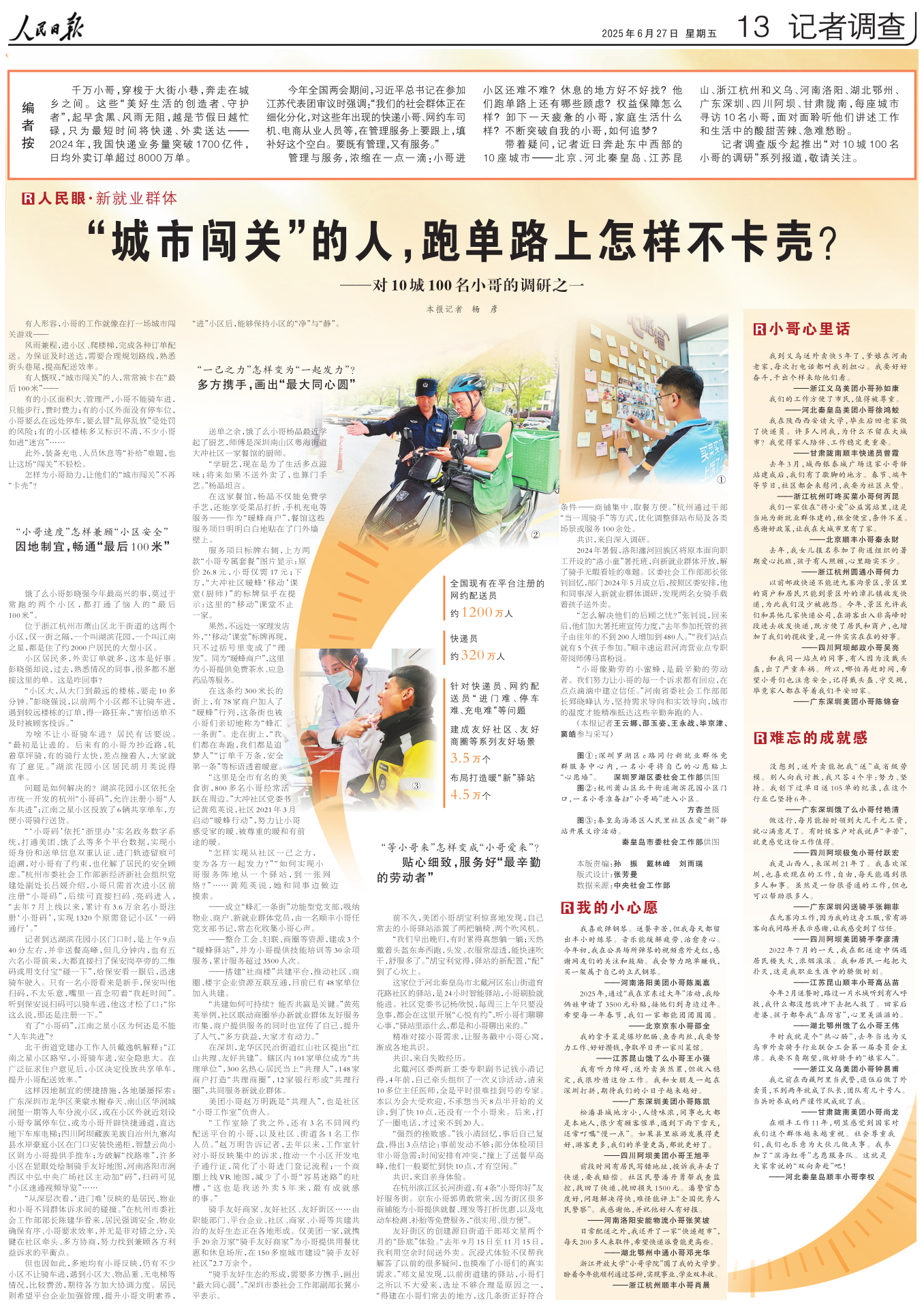 记者调查版今起推出“对10城100名小哥的调研”系列报道,敬请关注。