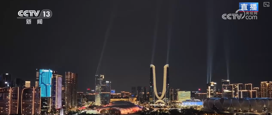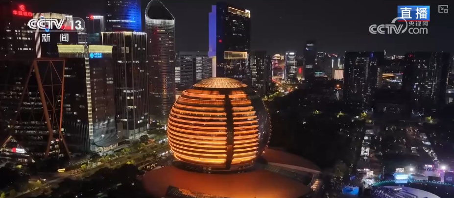 换个视角夜游杭州。如果说西湖代表了杭州的“历史”,那钱江新城代表了什么?这就要从三座建筑来说。这个金色的球形建筑是杭州国际会议中心,杭州的市民习惯把它直白的称呼为“大金球”。就在它的对面,整体造型如同一轮“半月形”的建筑是杭州大剧院。在这样的光影之下,如果一场夜市在这里举行会是什么样子?