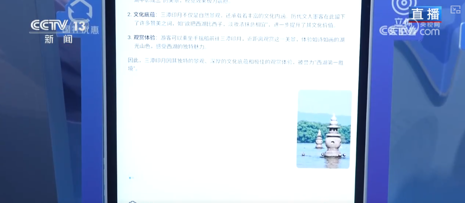 再进入时空对话舱,可以和苏东坡数字人谈古论今。而这款AI大模型将带你进入“苏东坡的邀约”,来一场沉浸式体验,解锁杭州的新玩儿法。比如苏轼所钟爱的杭州西湖,输入一张图片,它会告诉你这是西湖的什么地方,这是“三潭印月”。再继续追问,最佳游玩季节是什么时候?它会告诉你是秋季,尤其是月圆的中秋之夜。